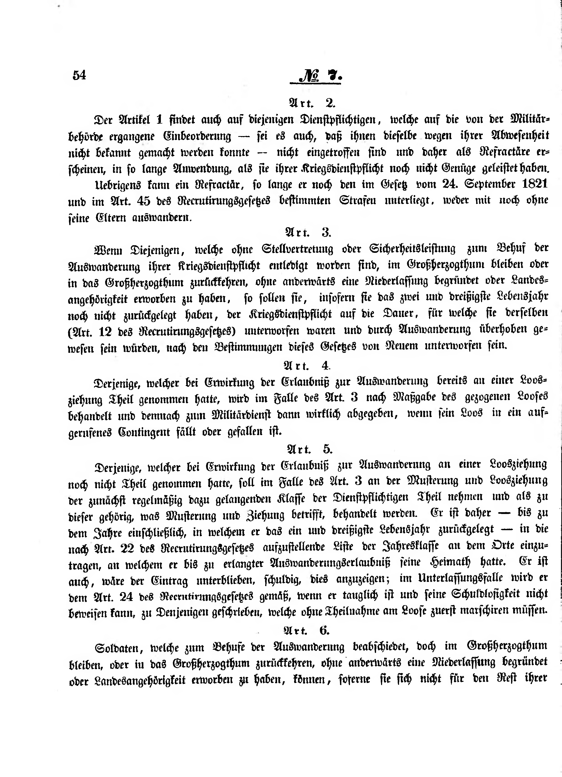 Wenn Diejenigen, welche ohne Stellvertretung oder Sicherheitsleistung zum Behuf der Auswanderung ihrer Kriegsdienstpflicht entledigt worden sind, im Großherzogthum bleiben oder in das Großherzogthum zurückkehren, ohne anderwärts eine Niederlassung begründet oder Landesangehörigkeit erworben zu haben, so sollen sie, insofern sie das zwei und dreißigste Lebensjahr noch nicht zurückgelegt haben, der Kriegsdienstpflicht auf die Dauer, für welche sie derselben (Art. 12 des Recrutirungsgesetzes) unterworfen waren und durch Auswanderung überhoben gewesen sein würden, nach den Bestimmungen dieses Gesetzes von Neuem unterworfen sein.