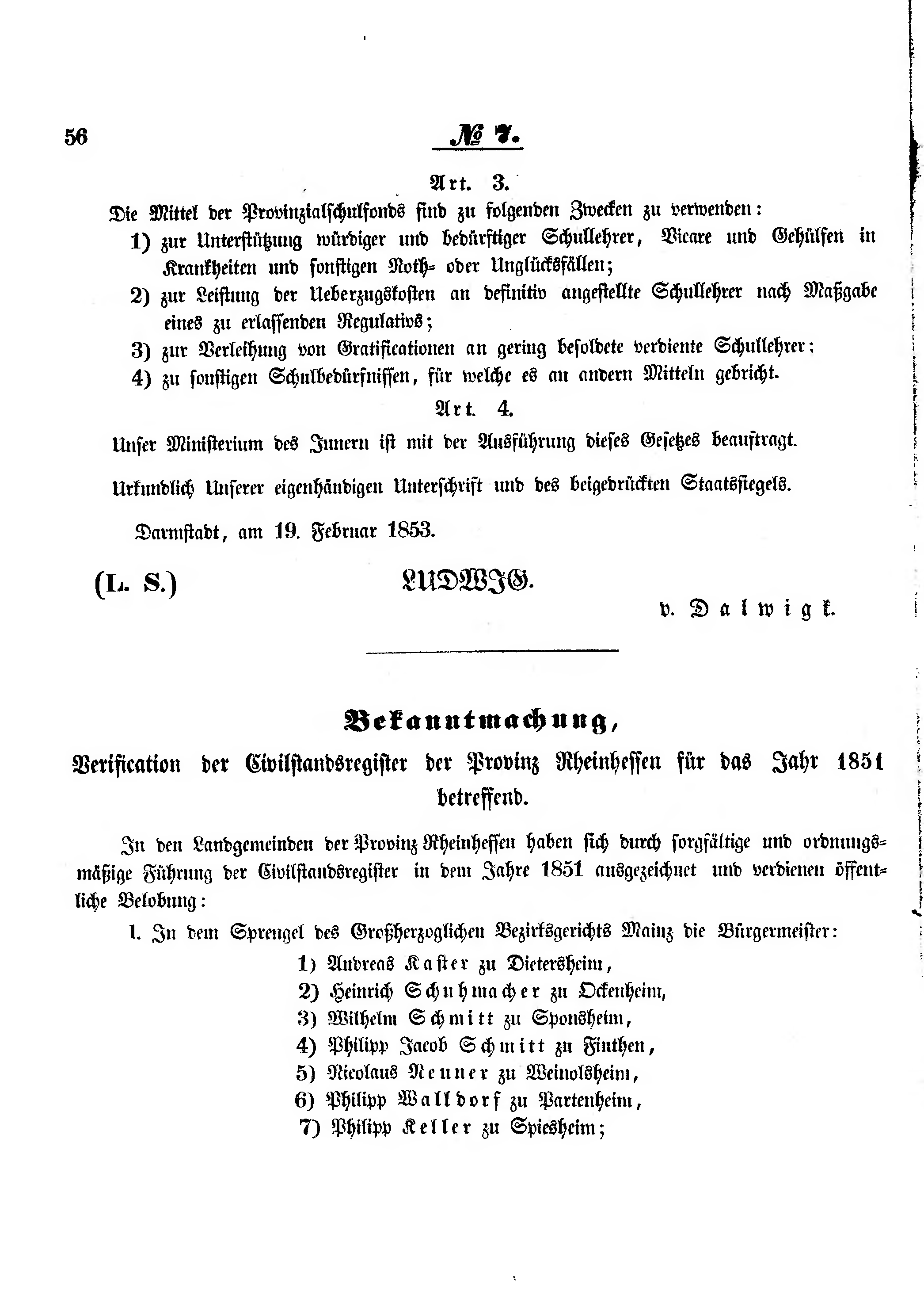 In den Landgemeinden der Provinz Rheinhessen haben sich durch sorgfältige und ordnungsmäßige Führung der Civilstandsregister in dem Jahre 1851 ausgezeichnet und verdienen öffentliche Belobung: