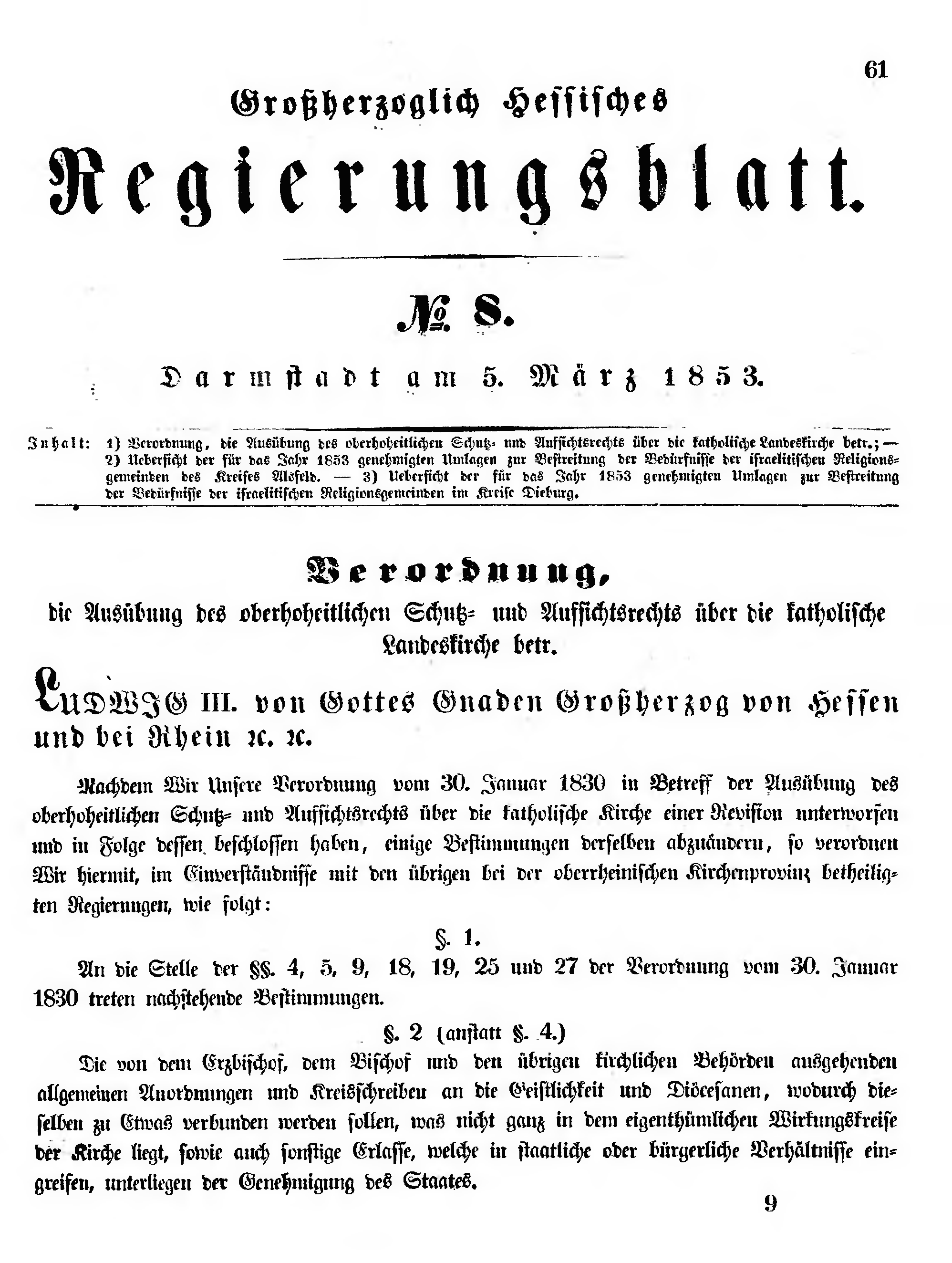 Inhalt: 1) Verordnung, die Ausübung des oberhoheitlichen Schutz- und Aufsichtsrechts über die katholische Landeskirche betr.; - 2) Uebersicht der für das Jahr 1853 genehmigten Umlagen zur Bestreitung der Bedürfnisse der israelitischen Religionsgemeinden des Kreises Alsfeld. - 3) Uebersicht der für das Jahr 1853 genehmigten Umlagen zur Bestreitung der Bedürfnisse der israelitischen Religionsgemeinden im Kreise Dieburg.
