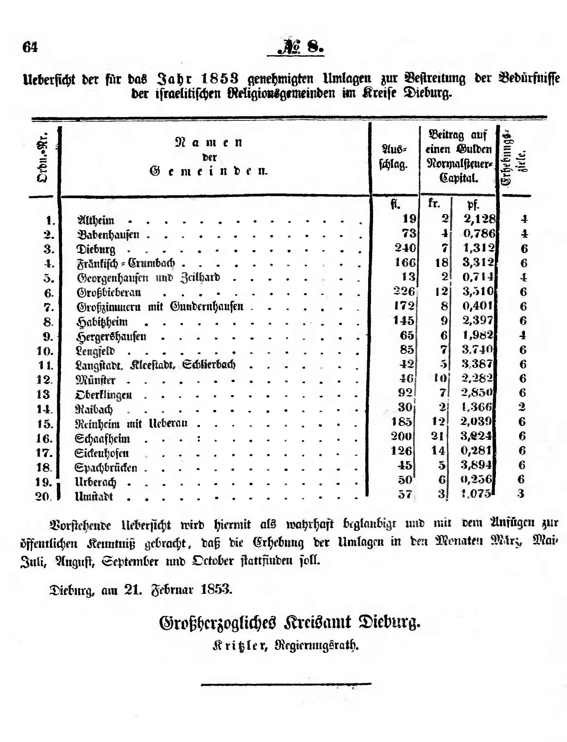 Uebersicht der für das Jahr 1853 genehmigten Umlagen zur Bestreitung der Bedürfnisse der israelitischen Religionsgemeinden des Kreises Dieburg.