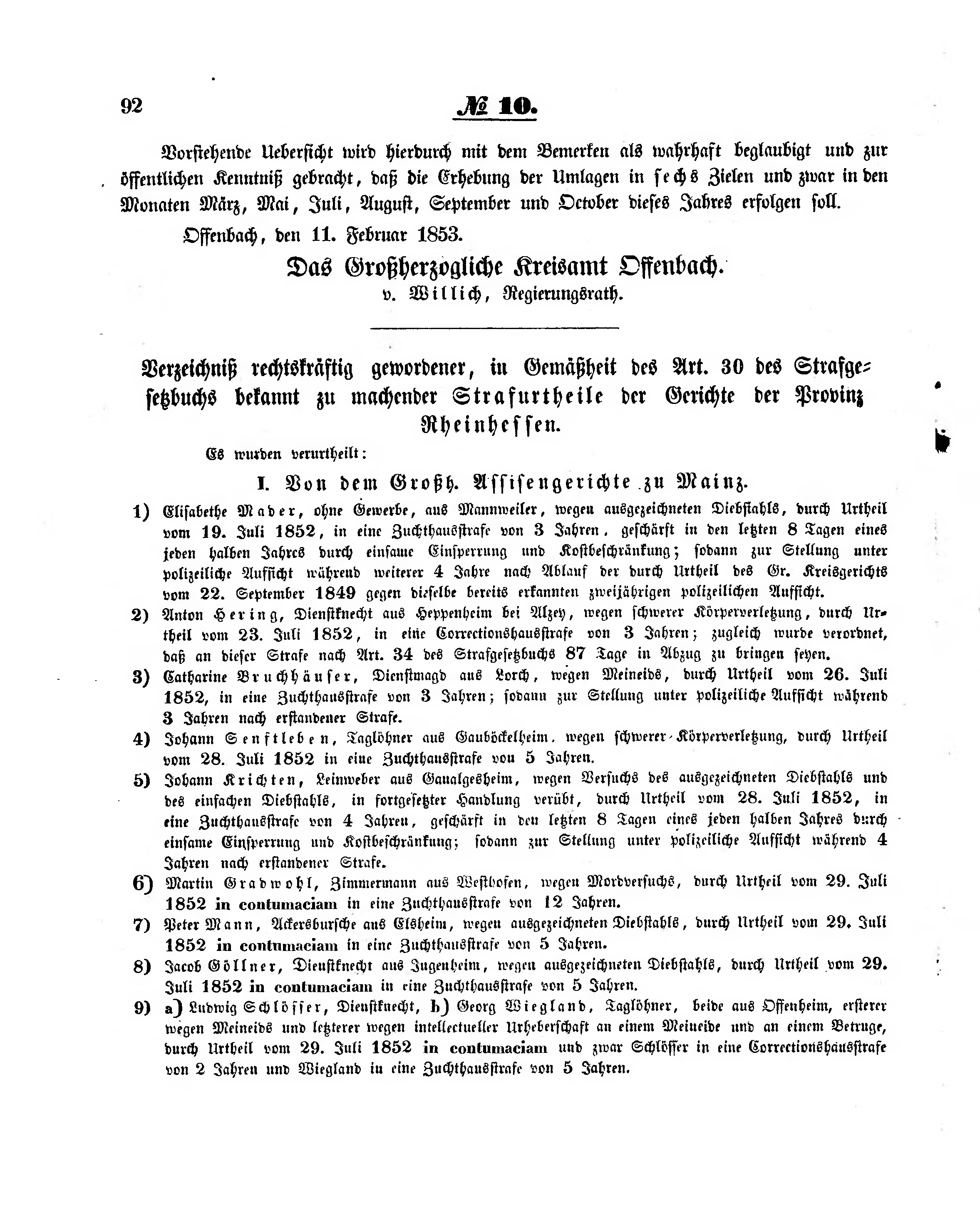 9) a) Ludwig Schlösser, Dienstknecht, b) Georg Wiegland, Taglöhner, beide aus Offenheim, ersterer wegen Meineids und letzterer wegen intellectueller Urheberschaft an einem Meineide und an einem Betruge, durch Urtheil vom 29. Juli 1852 in contumaciam und zwar Schlösser in eine Correctionshausstrafe von 2 Jahren und Wiegland in eine Zuchthausstrafe von 5 Jahren.