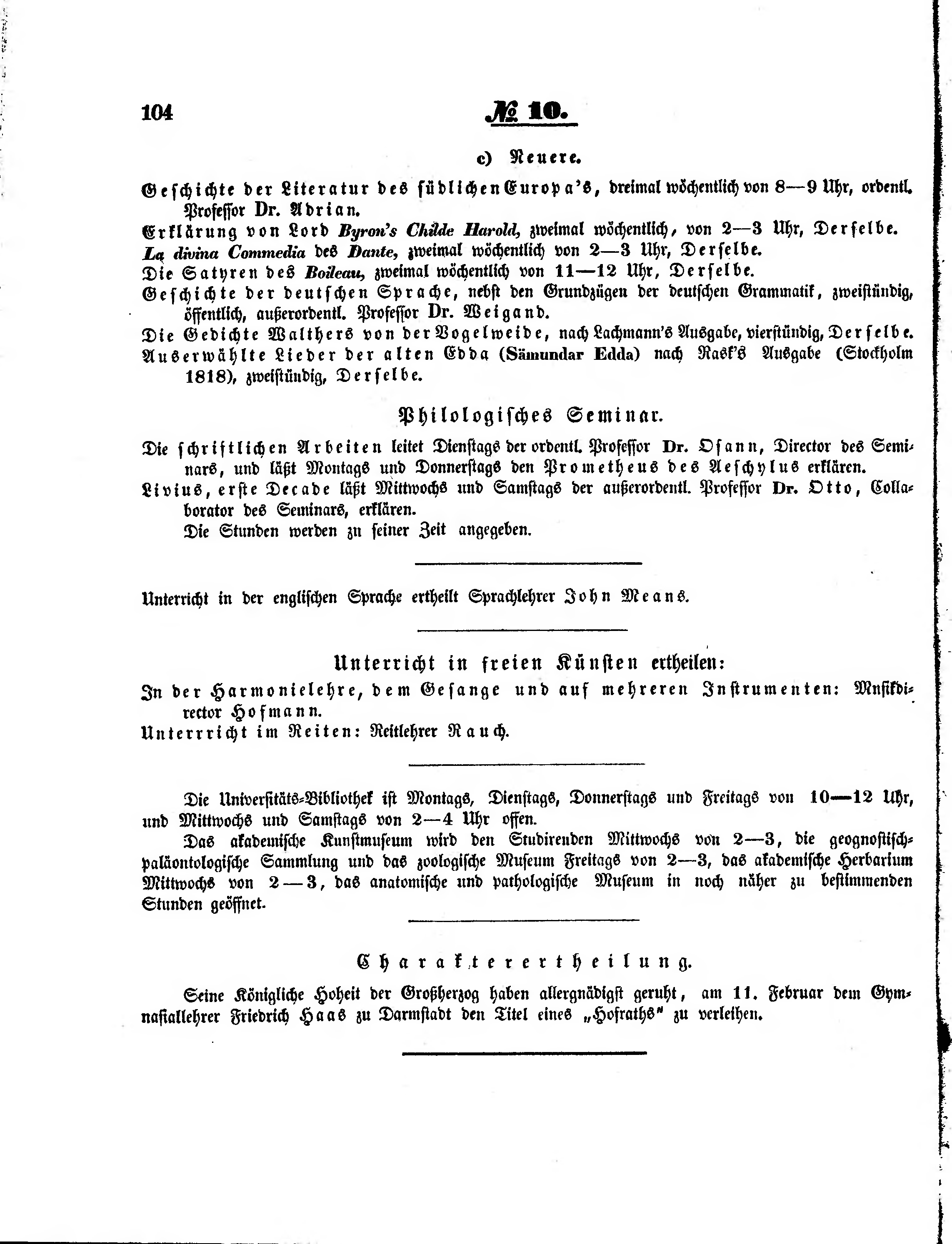 Die schriftlichen Arbeiten leitet Dienstags der ordentl. Professor Dr. Osann, Director des Seminars, und läßt Montags und Donnerstags den Prometheus des Aeschylus erklären.