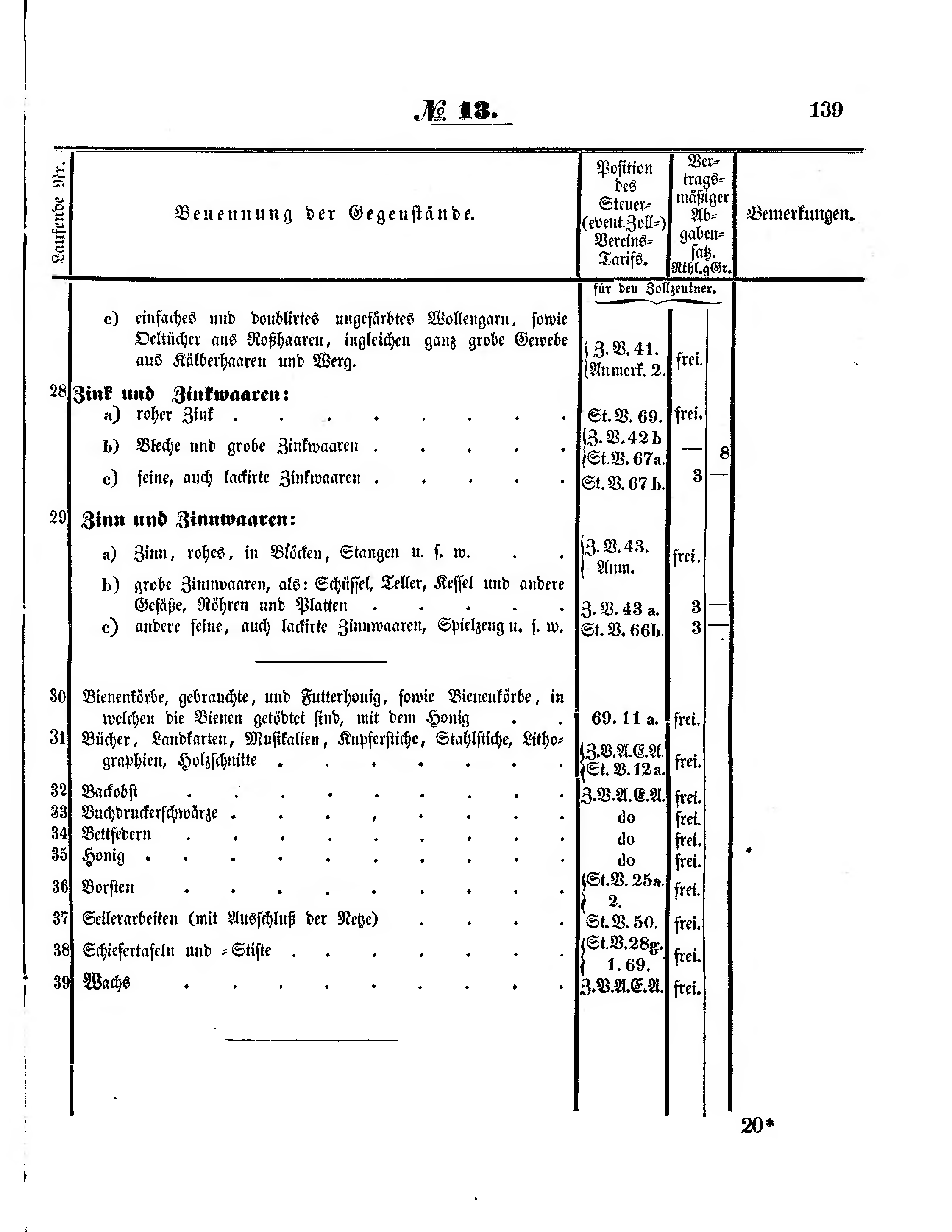 | c) | andere feine, auch lackirte Zinnwaaren, Spielzeug u.s.w. | St.V. 66b. | 3 | - | |||
