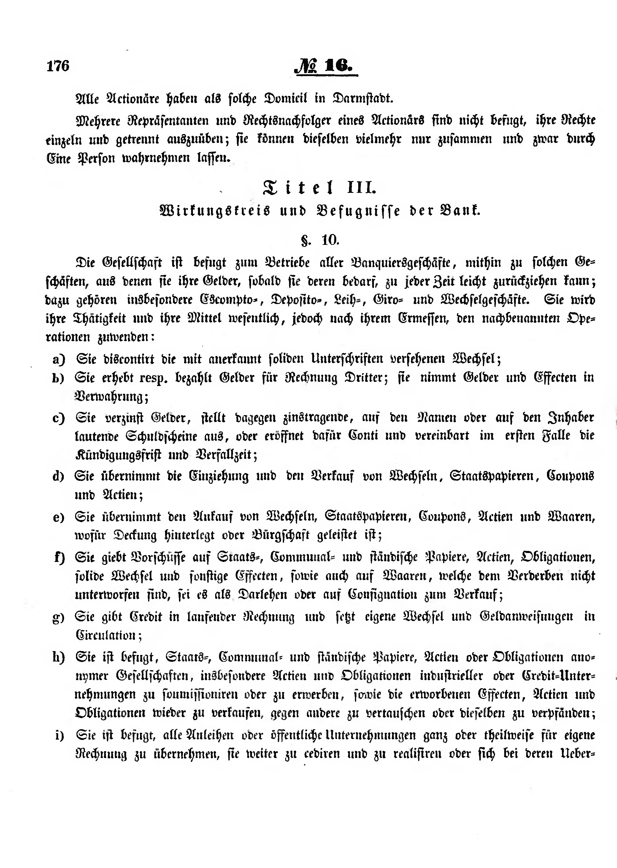 - h) Sie ist befugt, Staats-, Communal- und ständische Papiere, Actien oder Obligationen anonymer Gesellschaften, insbesondere Actien und Obligationen industrieller oder Credit-Unternehmungen zu soumissioniren oder zu erwerben, sowie die erworbenen Effecten, Actien und Obligationen wieder zu verkaufen, gegen andere zu vertauschen oder dieselben zu verpfänden;