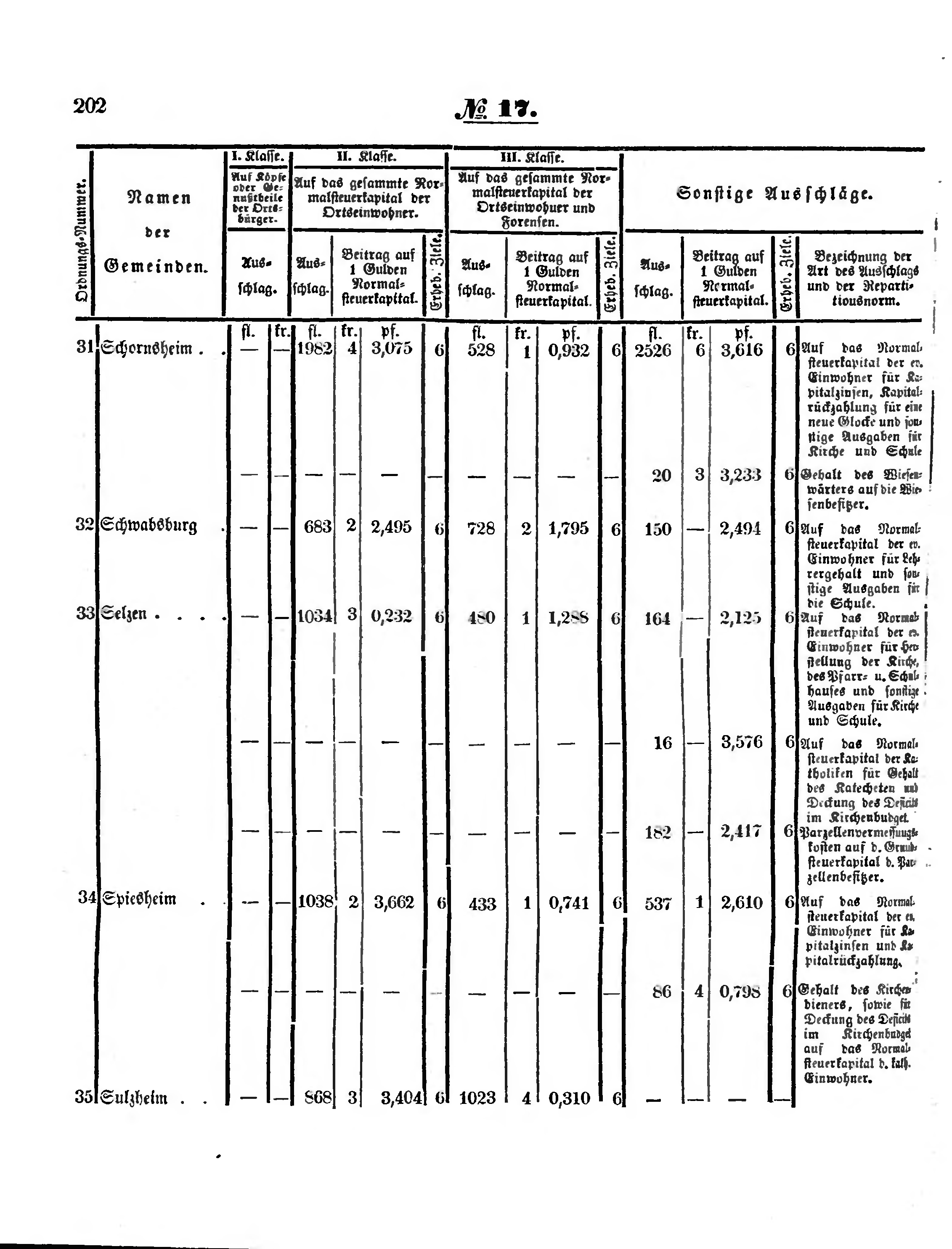 | 31 | Schornsheim | - | - | 1982 | 4 | 3,075 | 6 | 528 | 1 | 0,932 | 6 | 2526 | 6 | 3,616 | 6 | Auf das Normal- steuerkapital der ev. Einwohner für Ka- pitalzinsen, Kapital- rückzahlung für eine neue Glocke und son- stige Ausgaben für Kirche und Schule. |