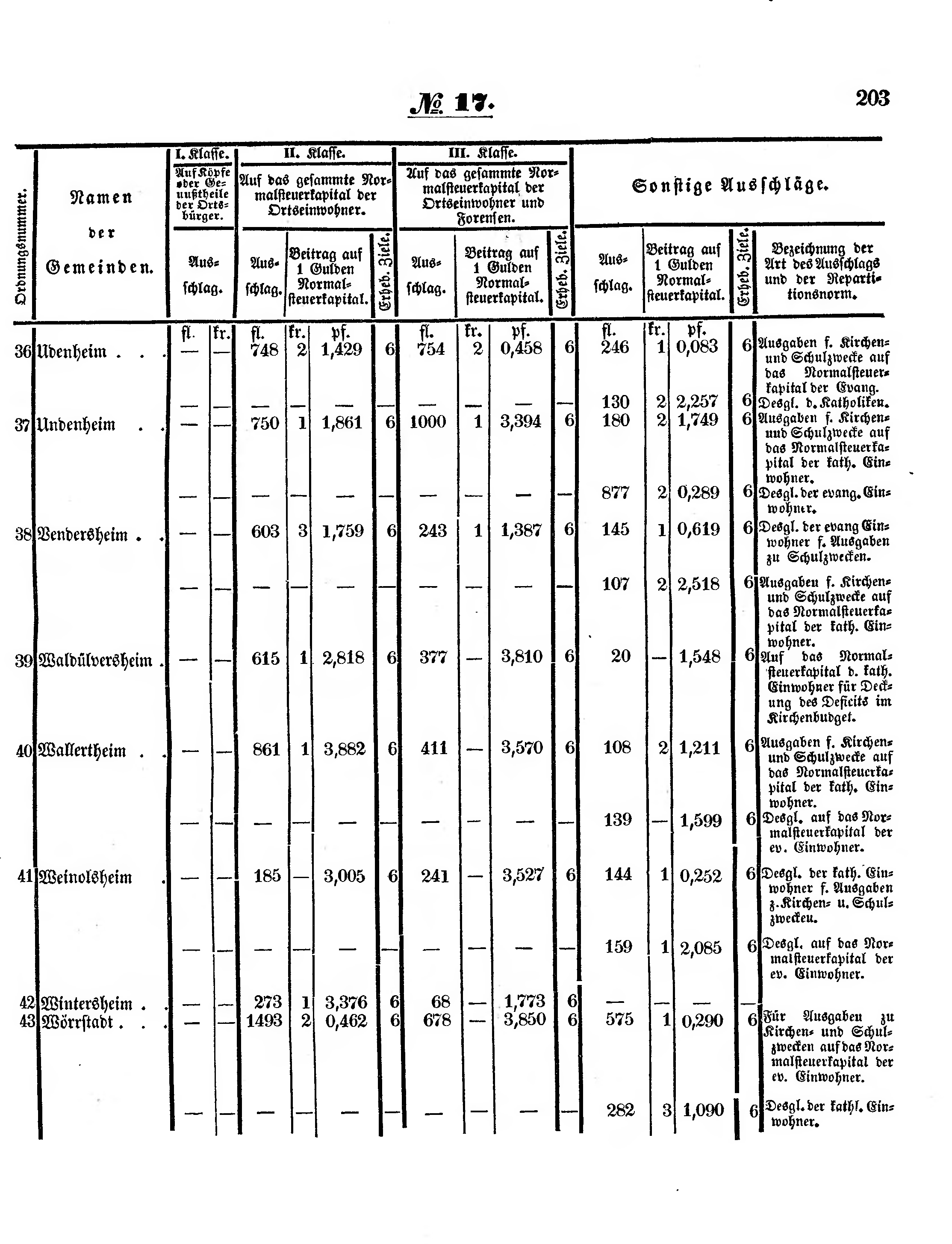 | 38 | Vendersheim | - | - | 603 | 3 | 1,759 | 6 | 243 | 1 | 1,387 | 6 | 145 | 1 | 0,619 | 6 | Desgl. der evang. Ein- wohner f. Ausgaben zu Schulzwecken. |