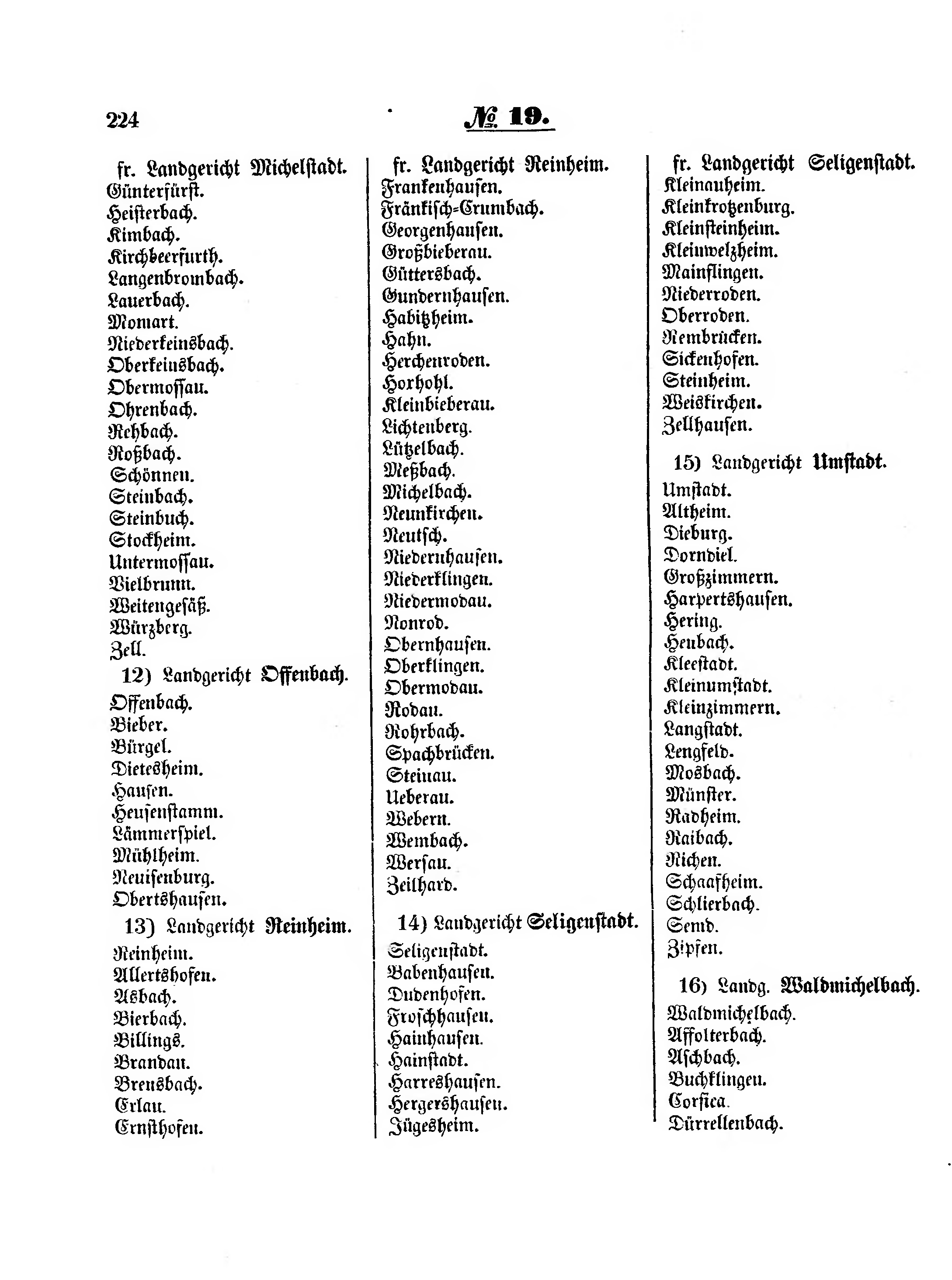 fr. Landgericht Seligenstadt. Kleinauheim. Kleinkrotzenburg. Kleinsteinheim. Kleinwelzheim. Mainflingen. Niederroden. Oberroden. Rembrücken. Sickenhofen. Steinheim. Weiskirchen. Zellhausen. 15) Landgericht Umstadt. Umstadt. Altheim. Dieburg. Dorndiel. Großzimmern. Harpertshausen. Hering. Heubach. Kleestadt. Kleinumstadt. Kleinzimmern. Langstadt. Lengfeld. Mosbach. Münster. Radheim. Raibach. Richen. Schaafheim. Schlierbach. Semd. Zipfen. 16) Landg. Waldmichelbach. Waldmichelbach. Affolterbach. Aschbach. Buchklingen. Corsica. Dürrellenbach. |