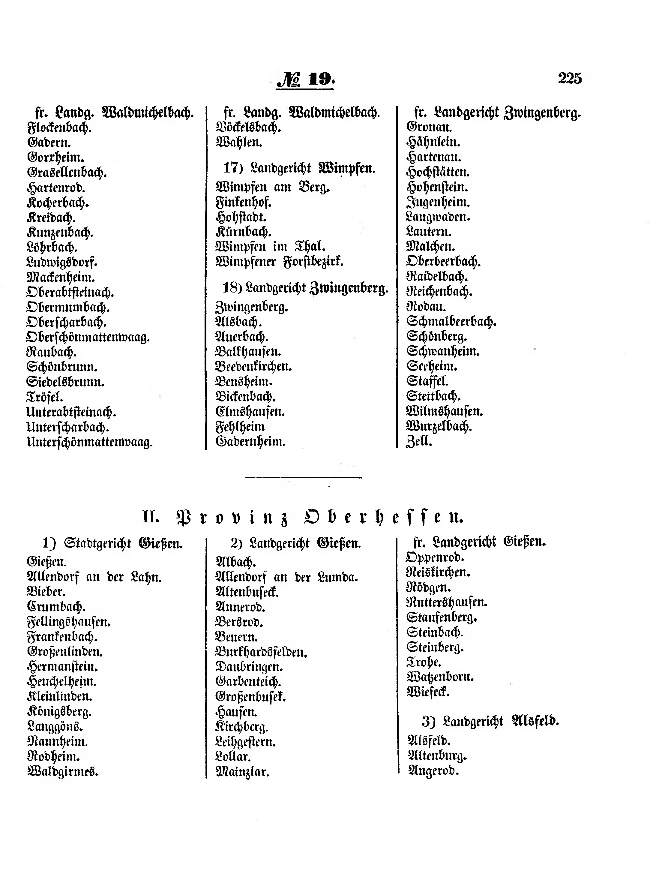 fr. Landg. Waldmichelbach. Vöckelsbach. Wahlen. 17) Landgericht Wimpfen. Wimpfen am Berg. Finkenhof. Hohstadt. Kürnbach. Wimpfen im Thal. Wimpfener Forstbezirk. 18) Landgericht Zwingenberg. Zwingenberg. Alsbach. Auerbach. Balkhausen. Beedenkirchen. Bensheim. Bickenbach. Elmshausen. Fehlheim Gadernheim. |