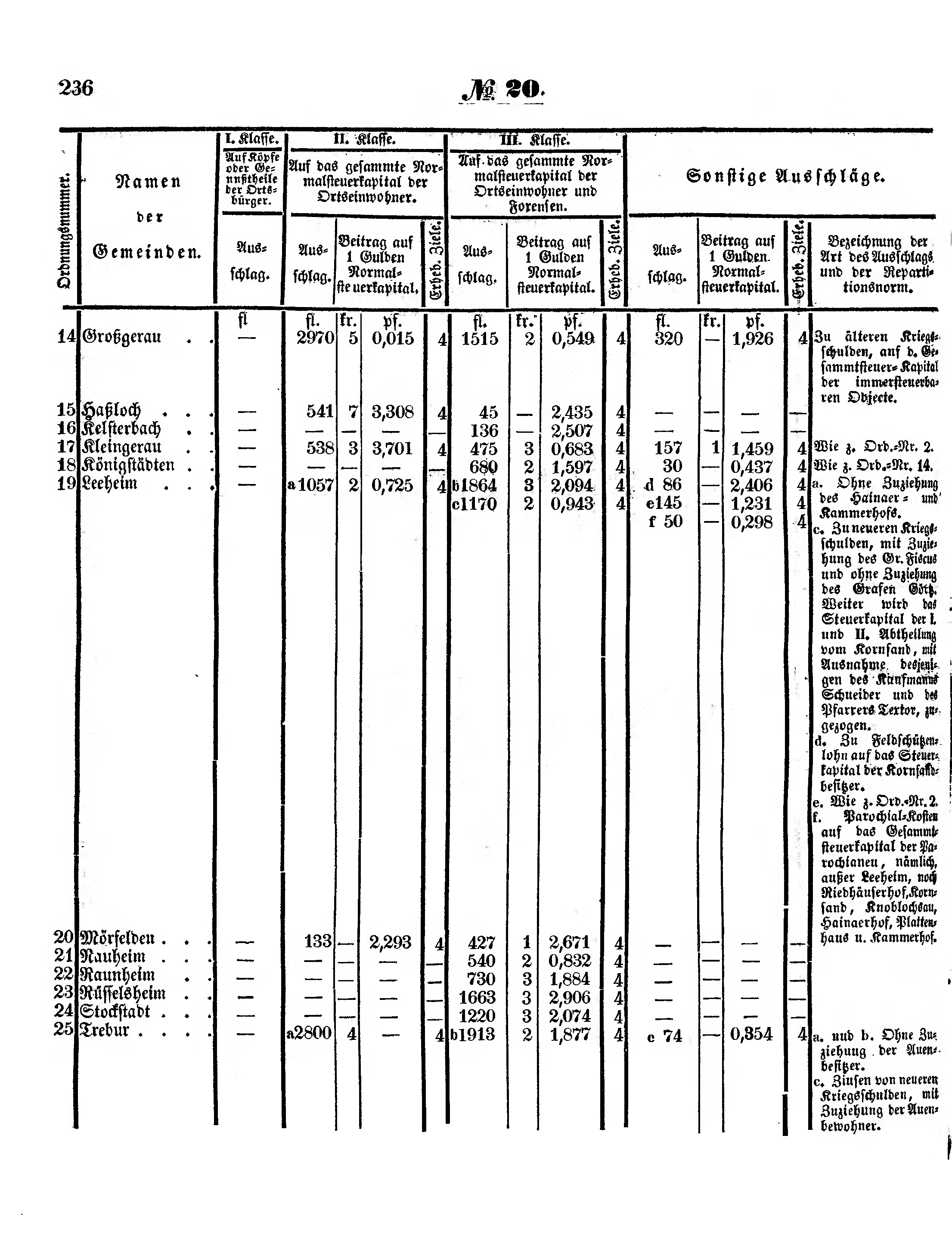 a. Ohne Zuziehung des Hainaer- und Kammerhofs. c. Zu neueren Kriegs schulden, mit Zuzie- hung des Gr. Fiscus und ohne Zuziehung des Grafen Görtz. Weiter wird das Steuerkapital der I. und II. Abtheilung vom Kornsand, mit Ausnahme desjeni- gen des Kaufmanns Schneider und des Pfarrers Textor, zugezogen. d. Zu Feldschützen- lohn auf das Steuer- kapital der Kornsand- besitzer. e. Wie z. Ord.-Nr. 2. f. Parochial-Kosten auf das Gesammt- steuerkapital der Pa- rochianen, nämlich, außer Leeheim, noch Riedhäuserhof, Korn- sand, Knoblochsau, Hainaerhof, Platten- haus u. Kammerhof. |