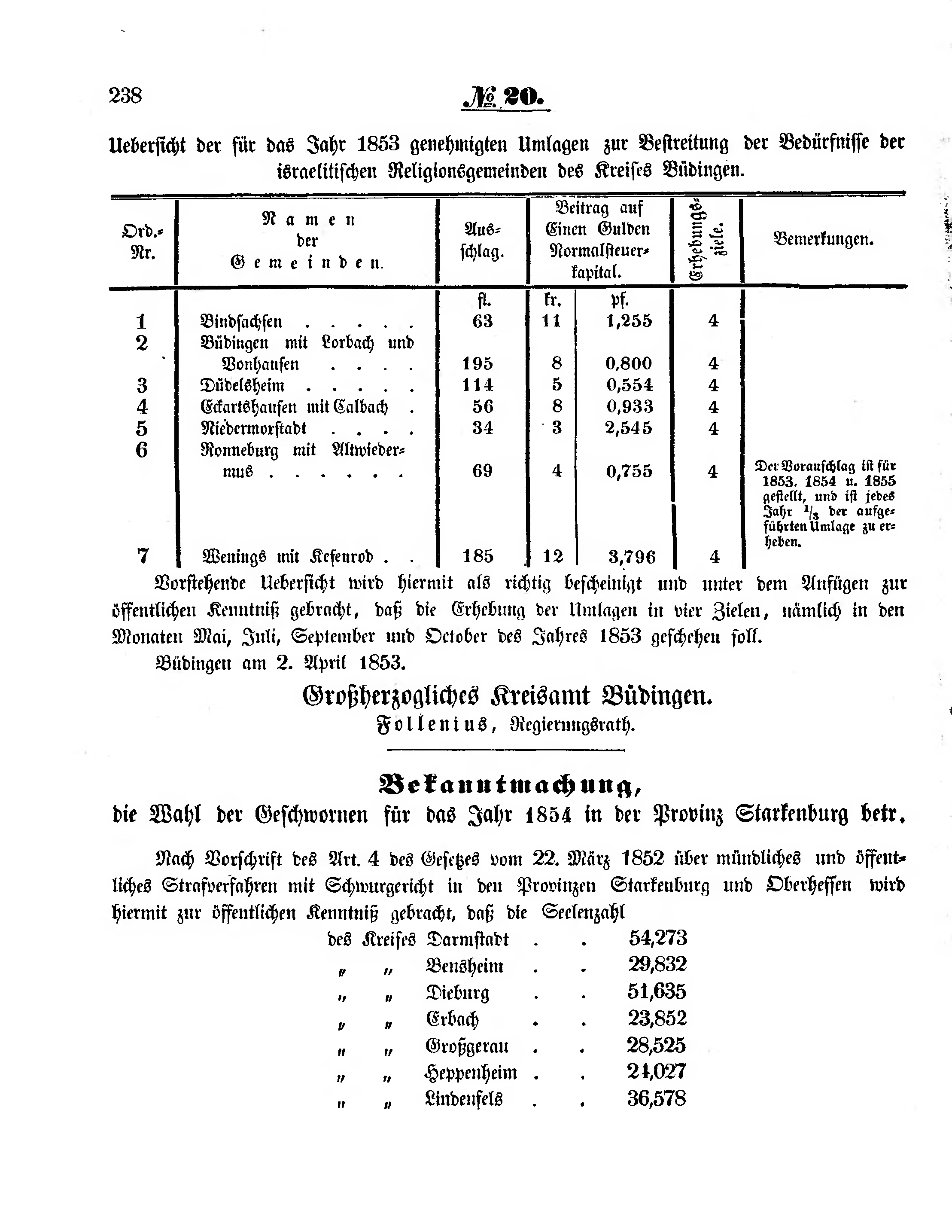 Uebersicht der für das Jahr 1853 genehmigten Umlagen zur Bestreitung der Bedürfnisse der israelitischen Religionsgemeinden des Kreises Büdingen.