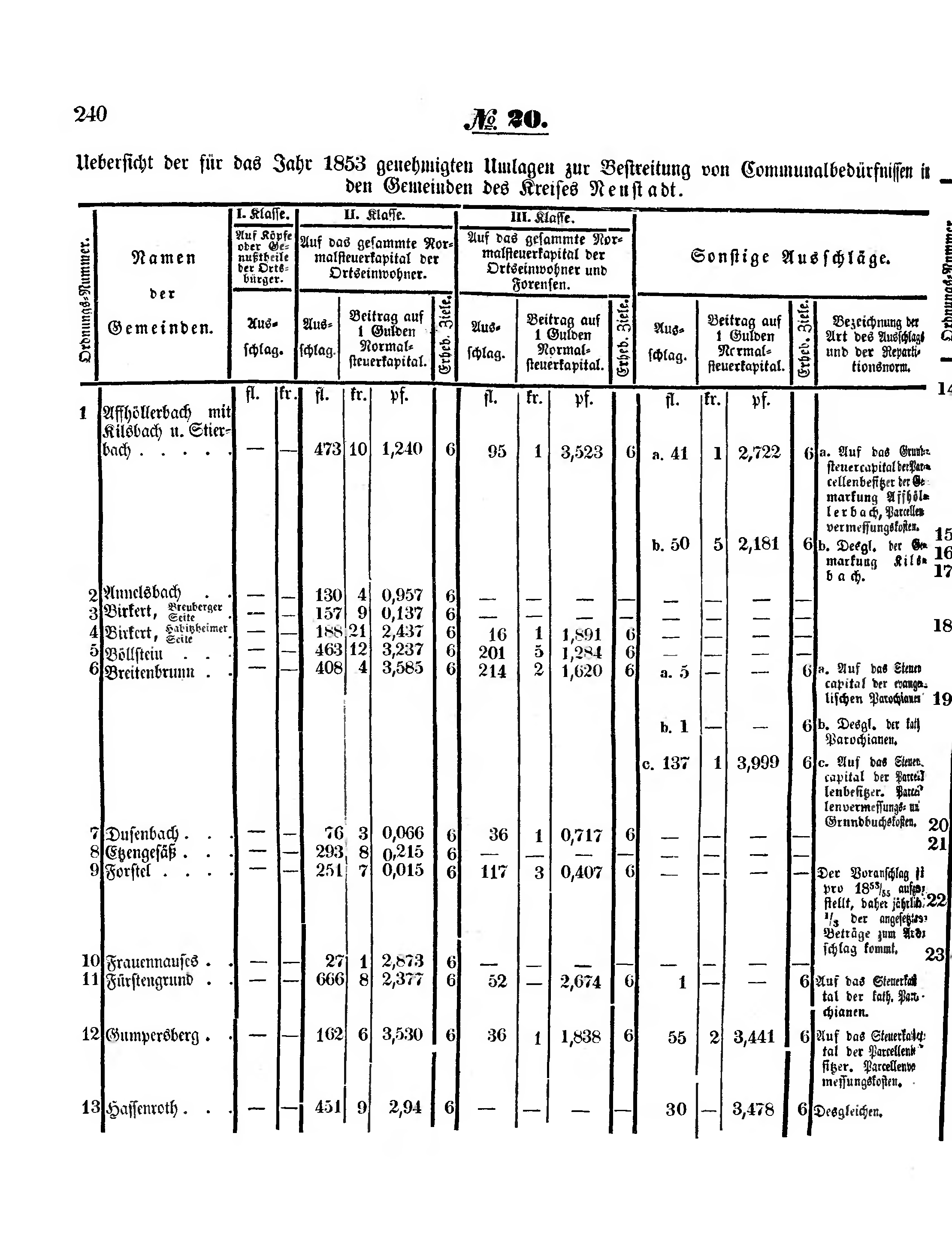Uebersicht der für das Jahr 1853 genehmigten Umlagen zur Bestreitung von Communalbedürfnissen in den Gemeinden des Kreises Neustadt.