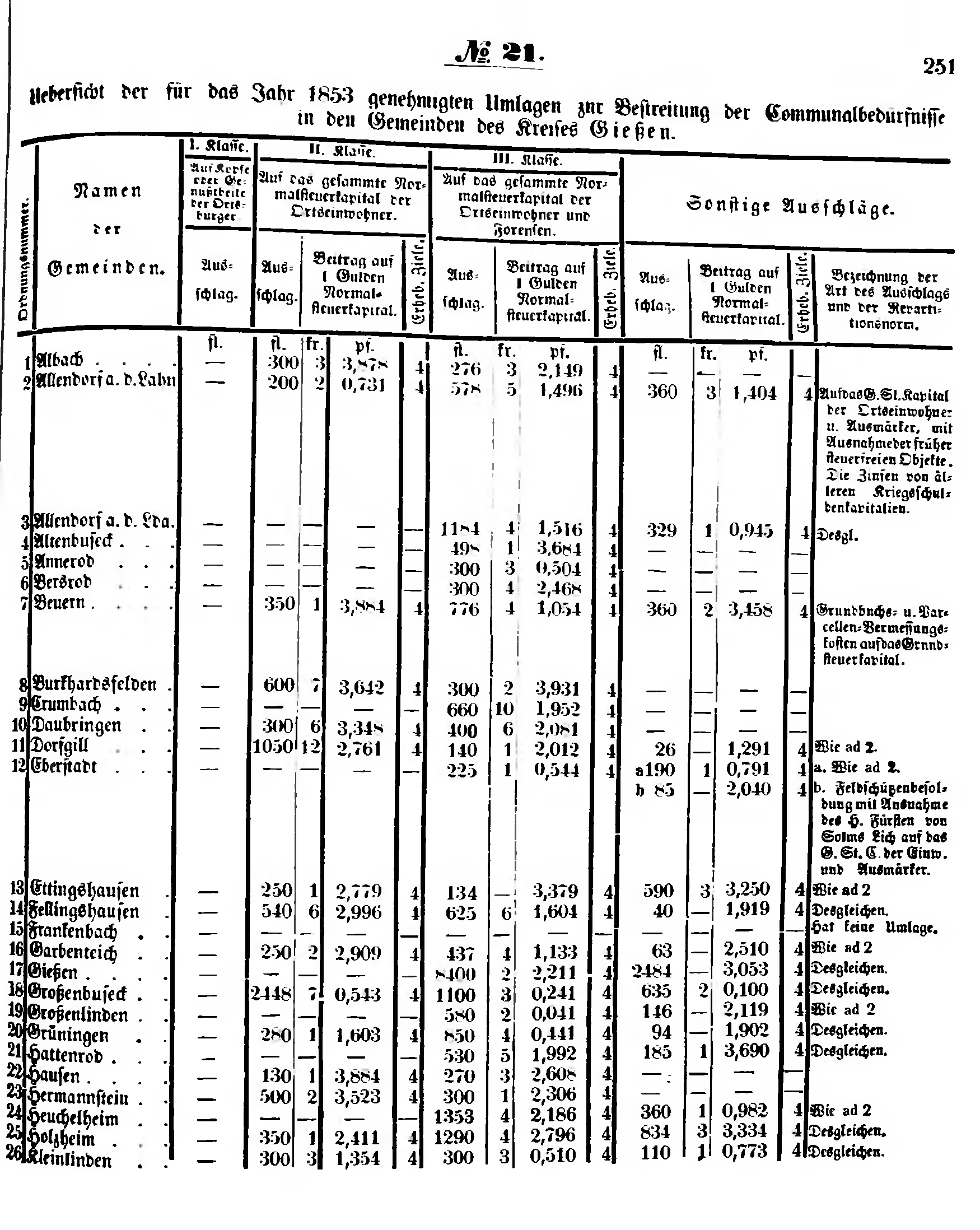 Uebersicht der für das Jahr 1853 genehmigten Umlagen zur Bestreitung der Communalbedürfnisse