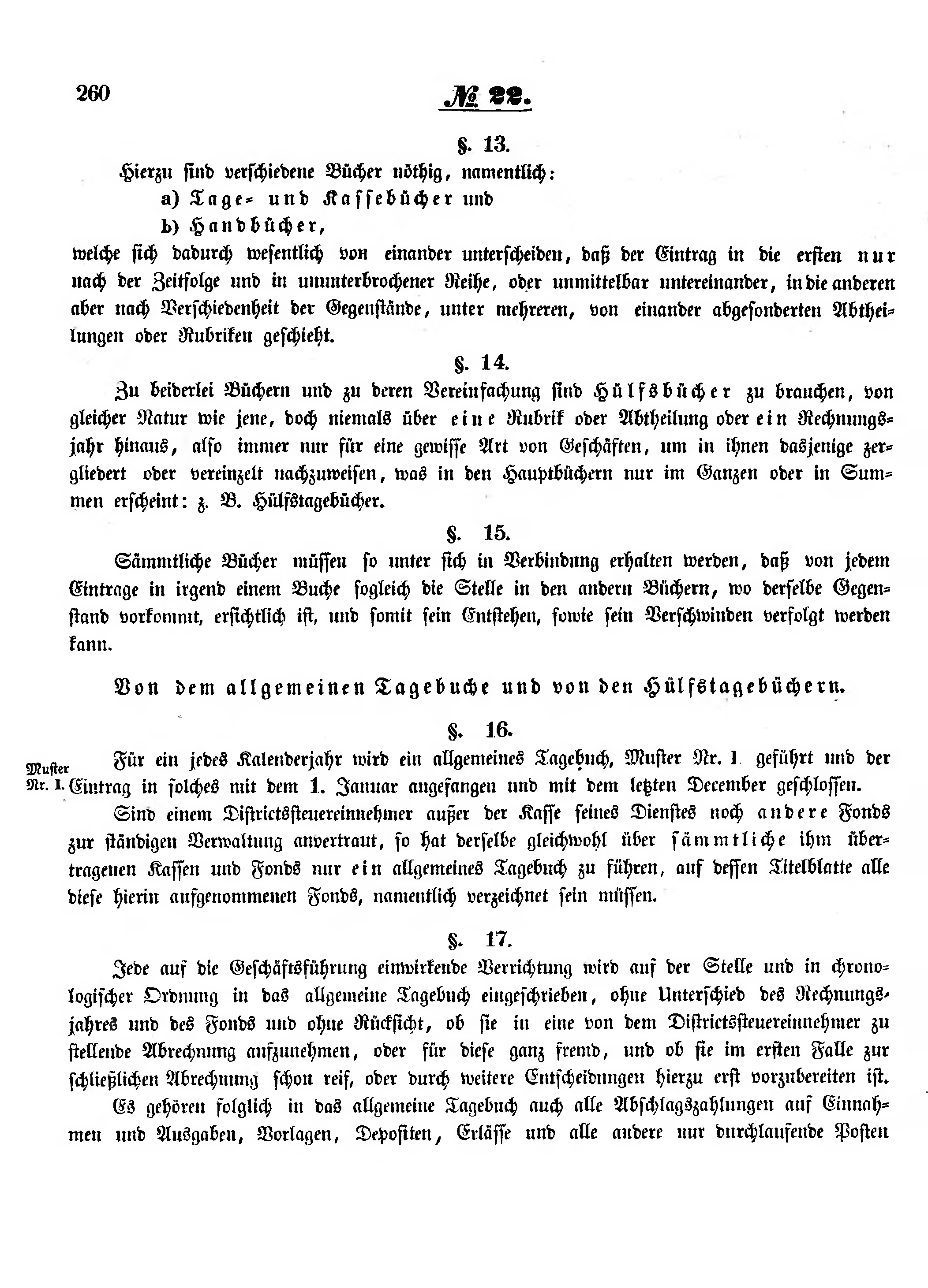 Jede auf die Geschäftsführung einwirkende Verrichtung wird auf der Stelle und in chronologischer Ordnung in das allgemeine Tagebuch eingeschrieben, ohne Unterschied des Rechnungsjahres und des Fonds und ohne Rücksicht, ob sie in eine von dem Districtssteuereinnehmer zu stellende Abrechnung aufzunehmen, oder für diese ganz fremd, und ob sie im ersten Falle zur schließlichen Abrechnung schon reif, oder durch weitere Entscheidungen hierzu erst vorzubereiten ist.