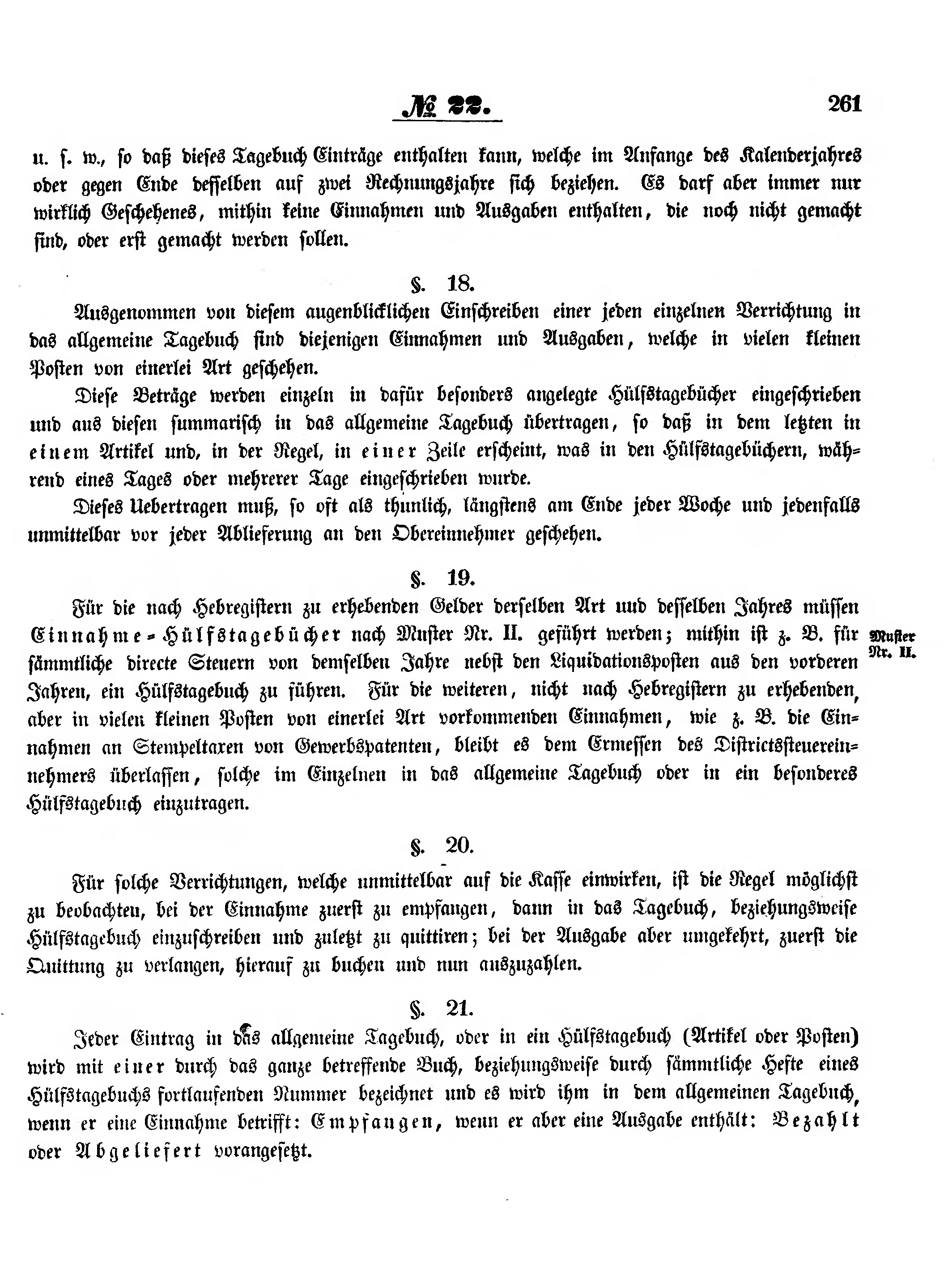 Für die nach Hebregistern zu erhebenden Gelder derselben Art und desselben Jahres müssen Einnahme-Hülfstagebücher nach Muster Nr. II. geführt werden; mithin ist z. B. für sämmtliche directe Steuern von demselben Jahre nebst den Liquidationsposten aus den vorderen Jahren, ein Hülfstagebuch zu führen. Für die weiteren, nicht nach Hebregistern zu erhebenden, aber in vielen kleinen Posten von einerlei Art vorkommenden Einnahmen, wie z. B. die Einnahmen an Stempeltaxen von Gewerbspatenten, bleibt es dem Ermessen des Districtssteuereinnehmers überlassen, solche im Einzelnen in das allgemeine Tagebuch oder in ein besonderes Hülfstagebuch einzutragen.