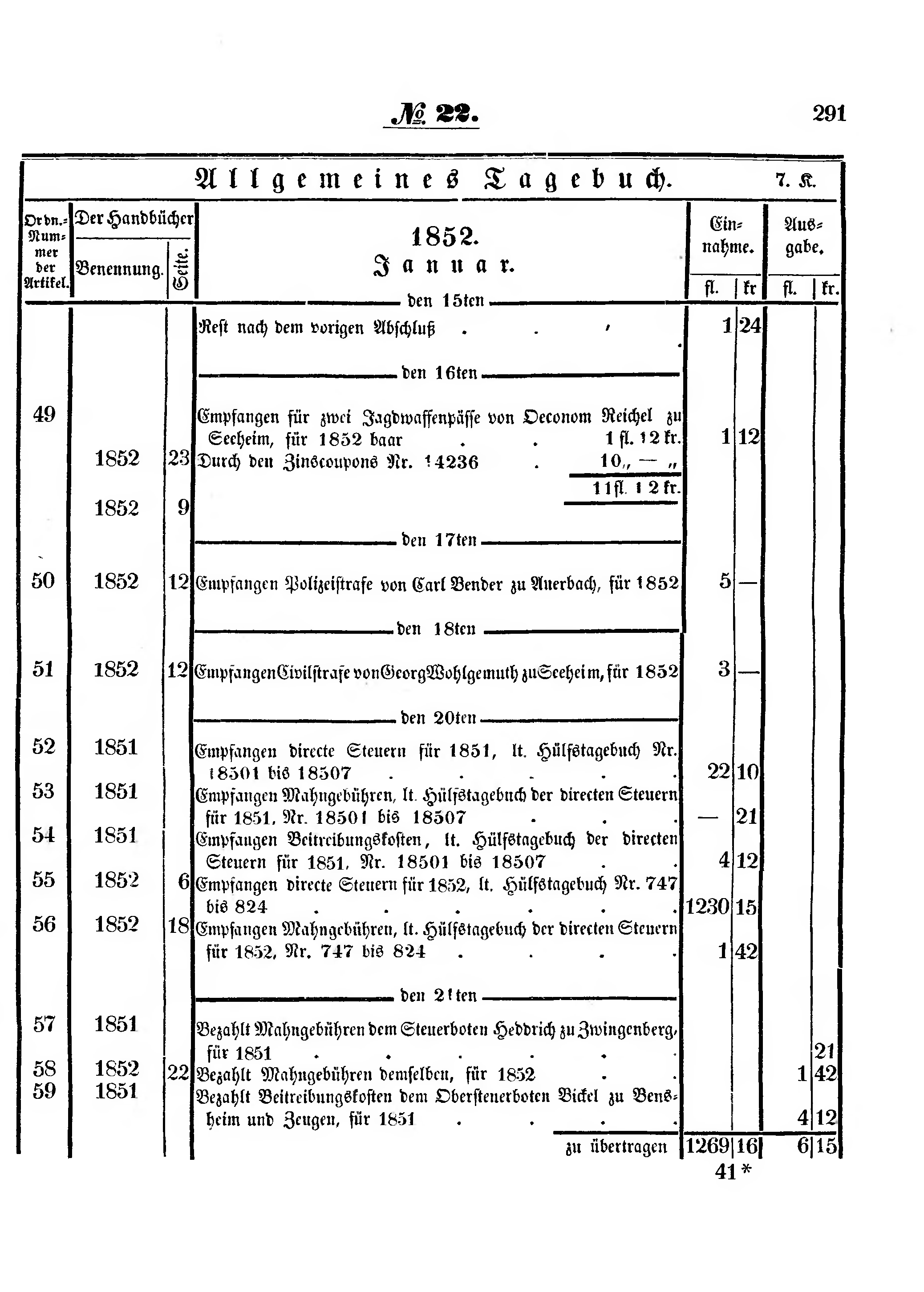 | 49 | Empfangen für zwei Jagdwaffenpässe von Oeconom Reichel[1] zu Seeheim, für 1852 baar | 1 | fl. | 12 | kr. | 1 | 12 | ||||