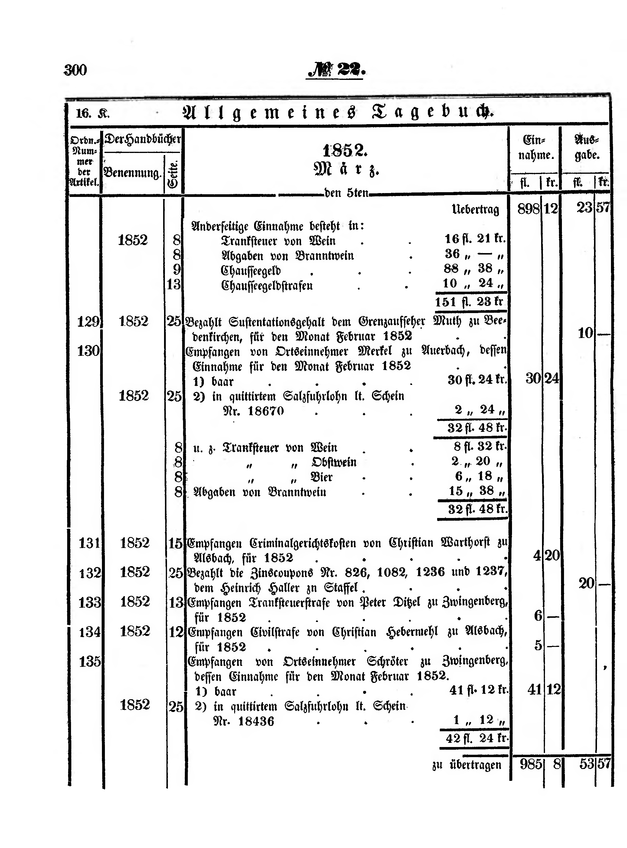 | 135 | Empfangen von Ortseinnehmer Schröter[1] zu Zwingenberg, dessen Einnahme für den Monat Februar 1852. | ||||||||||