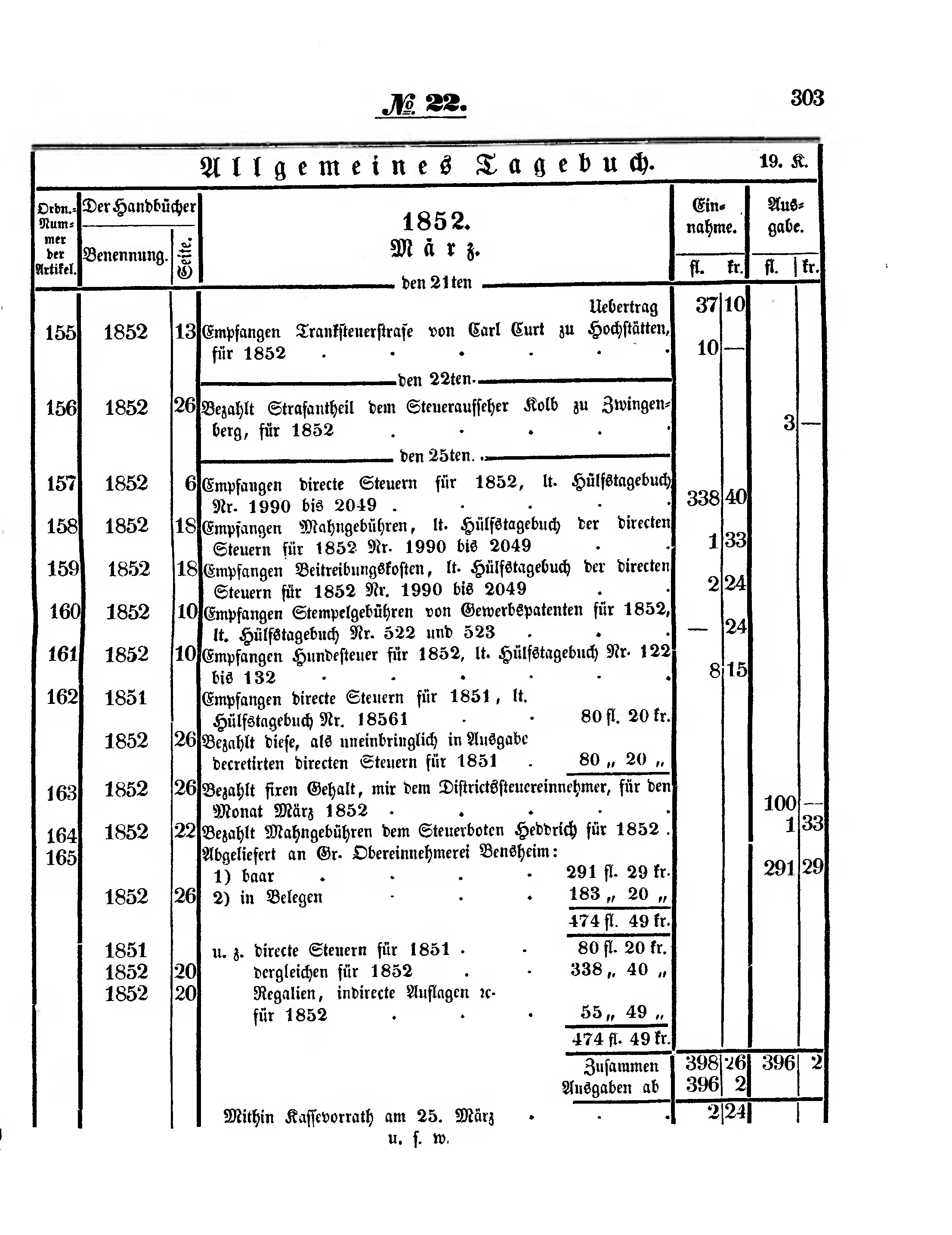 | 163 | 1852 | 26 | Bezahlt fixen Gehalt, mir dem Districtssteuereinnehmer, für den Monat März 1852 | 100 | - | ||||||