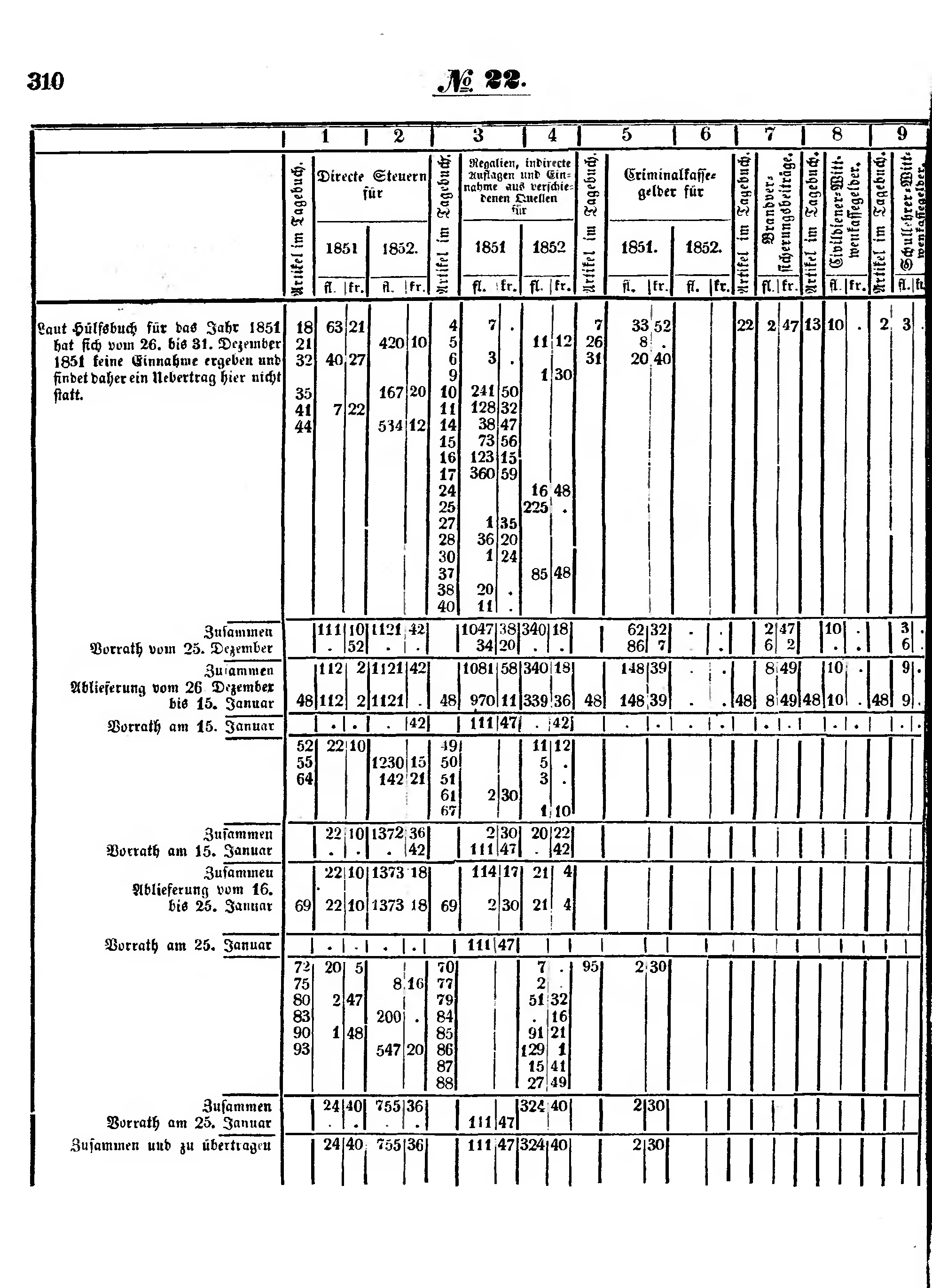 | Laut Hülfebuch für das Jahr 1851 hat sich vom 26. bis 31. Dezember 1851 keine Einnahme ergebe und findet daher ein Uebertrag hier nicht statt. |