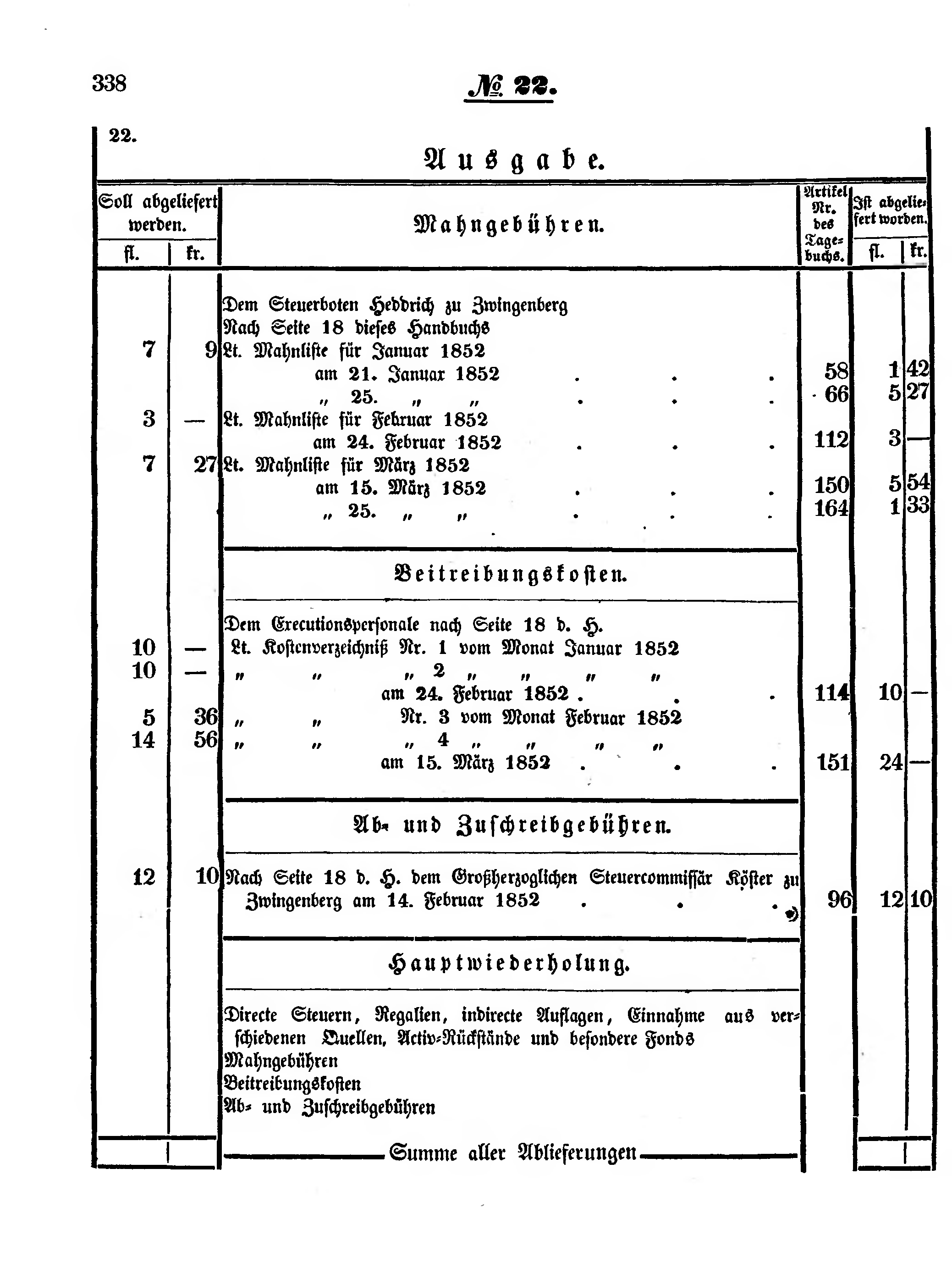 | 12 | 10 | Nach Seite 18 d. H. dem Großherzoglichen Steuercommissär Köster[1] zu Zwingenberg am 14. Februar 1852 |