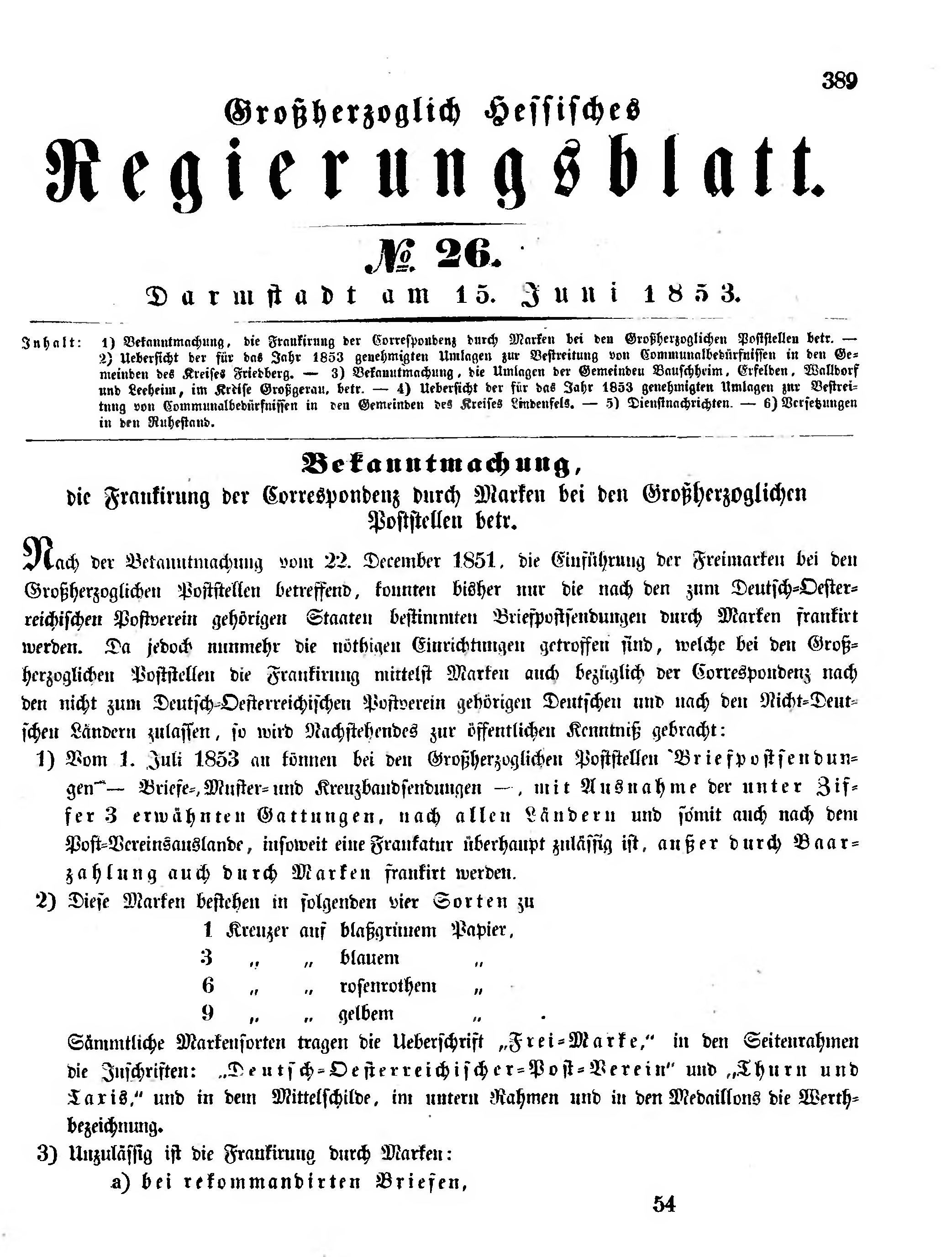 1) Vom 1. Juli 1853 an können bei den Großherzoglichen Poststellen Briefpostsendungen - Briefe-, Muster- und Kreuzbandsendungen - , mit Ausnahme der unter Ziffer 3 erwähnten Gattungen, nach allen Ländern und somit auch nach dem Post-Vereinsauslande, insoweit eine Frankatur überhaupt zulässig ist, außer durch Baarzahlung auch durch Marken frankirt werden.
