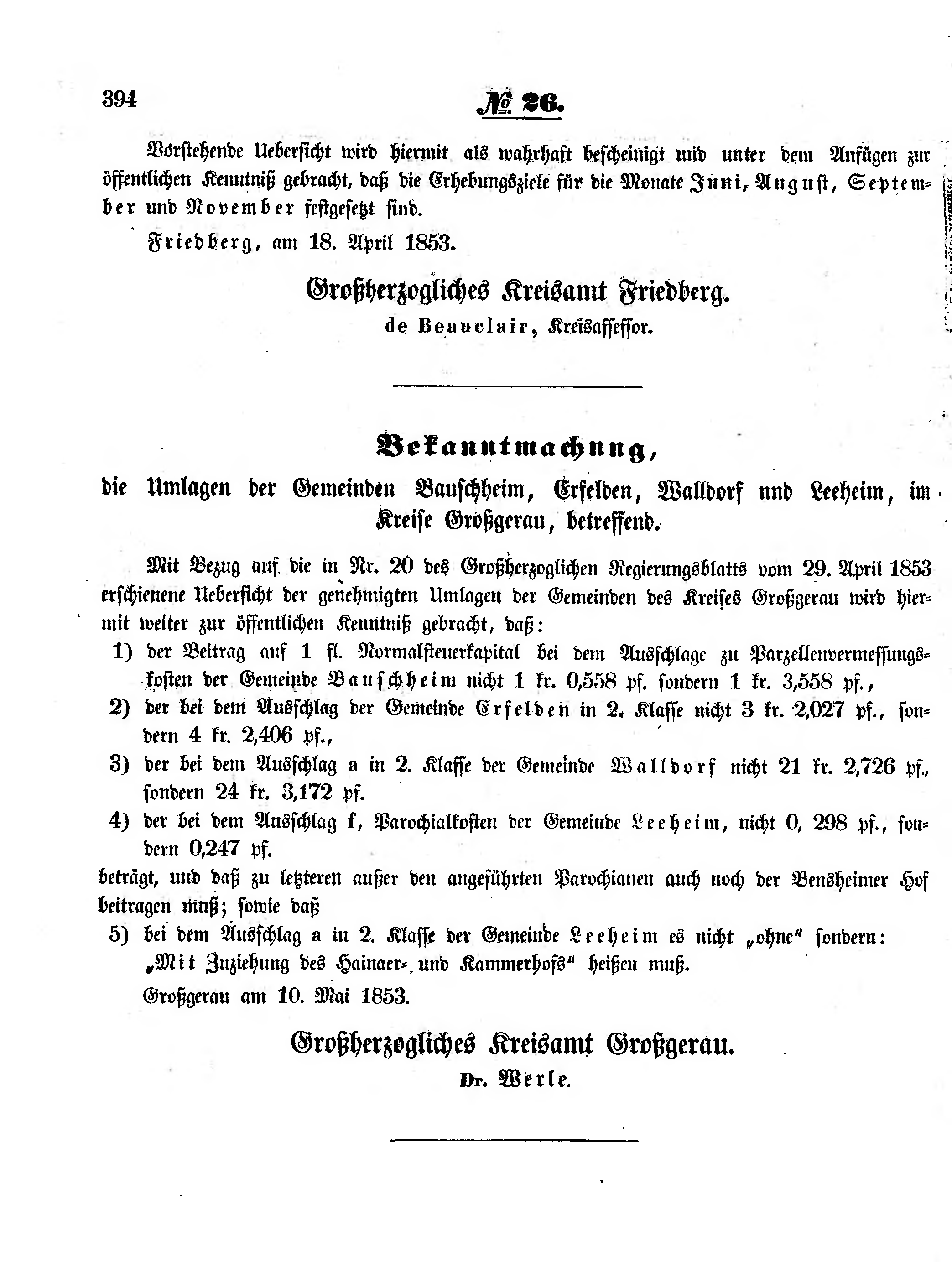 Mit Bezug auf die in Nr. 20 des Großherzoglichen Regierungsblatts vom 29. April 1853 erschienene Uebersicht der genehmigten Umlagen der Gemeinden des Kreises Großgerau wird hiermit weiter zur öffentlichen Kenntniß gebracht, daß: