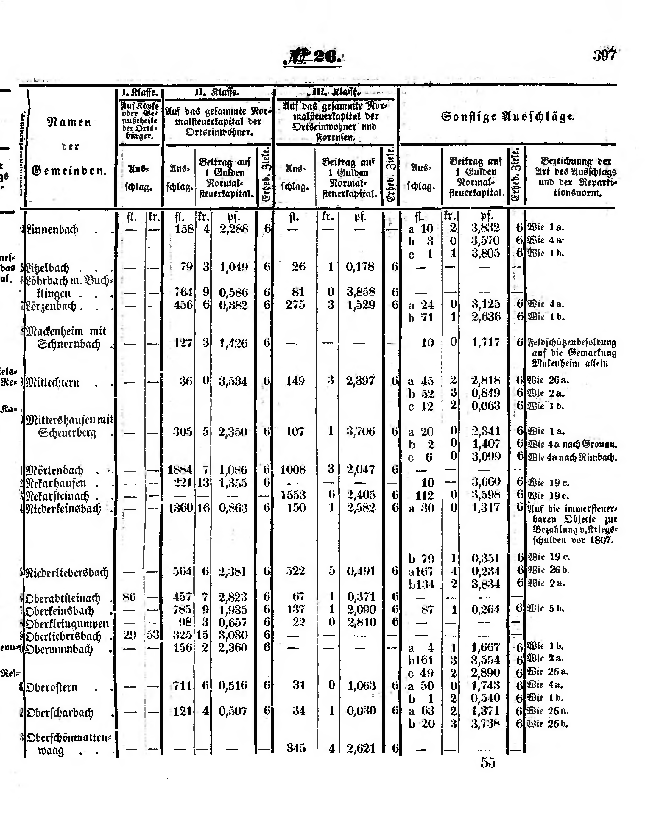 | 54 | Niederkeinsbach | - | - | 1360 | 16 | 0,863 | 6 | 150 | 1 | 2,582 | 6 | a 30 | 0 | 1,317 | 6 | Auf die immersteuer- baren Objecte zur Bezahlung v. Kriegs- schulden vor 1807. |