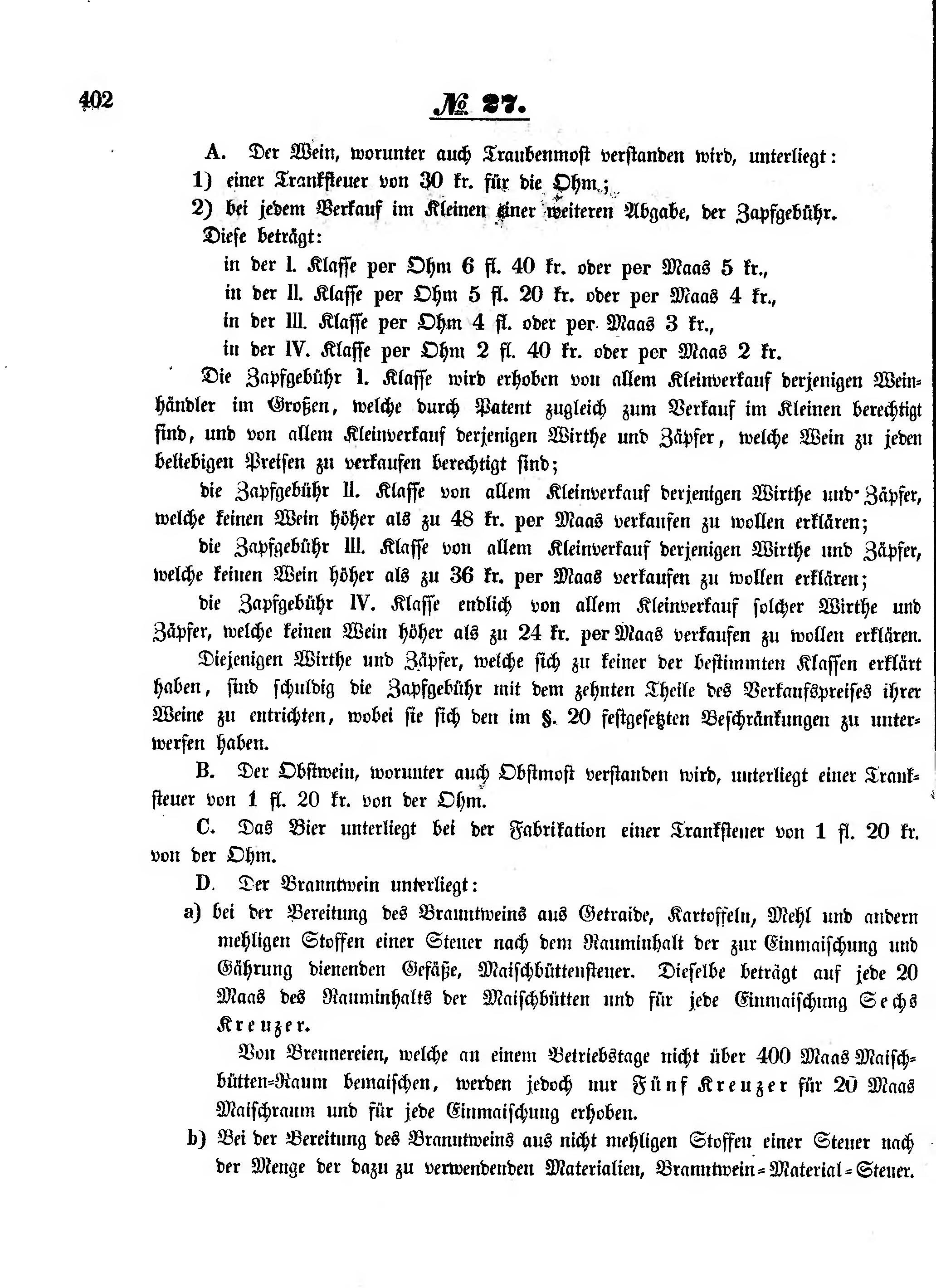 - a) bei der Bereitung des Branntweins aus Getraide, Kartoffeln, Mehl und andern mehligen Stoffen einer Steuer nach dem Rauminhalt der zur Einmaischung und Gährung dienenden Gefäße, Maischbüttensteuer. Dieselbe beträgt auf jede 20 Maas des Rauminhalts der Maischbütten und für jede Einmaischung Sechs Kreuzer.
