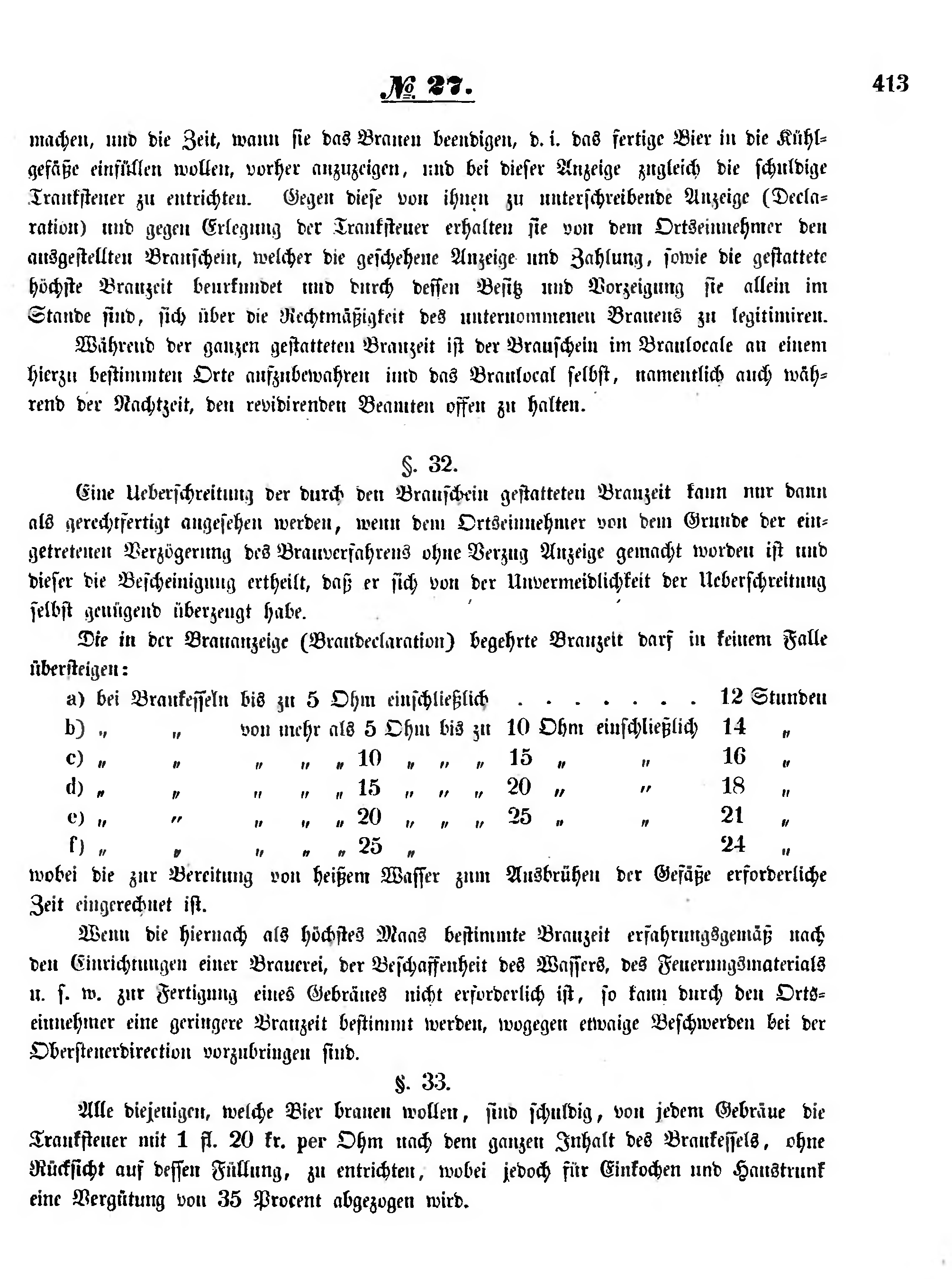 Wenn die hiernach als höchstes Maas bestimmte Brauzeit erfahrungsgemäß nach den Einrichtungen einer Brauerei, der Beschaffenheit des Wassers, des Feuerungsmaterials u. s. w. zur Fertigung eines Gebräues nicht erforderlich ist, so kann durch den Ortseinnehmer eine geringere Brauzeit bestimmt werden, wogegen etwaige Beschwerden bei der Obersteuerdirection vorzubringen sind.