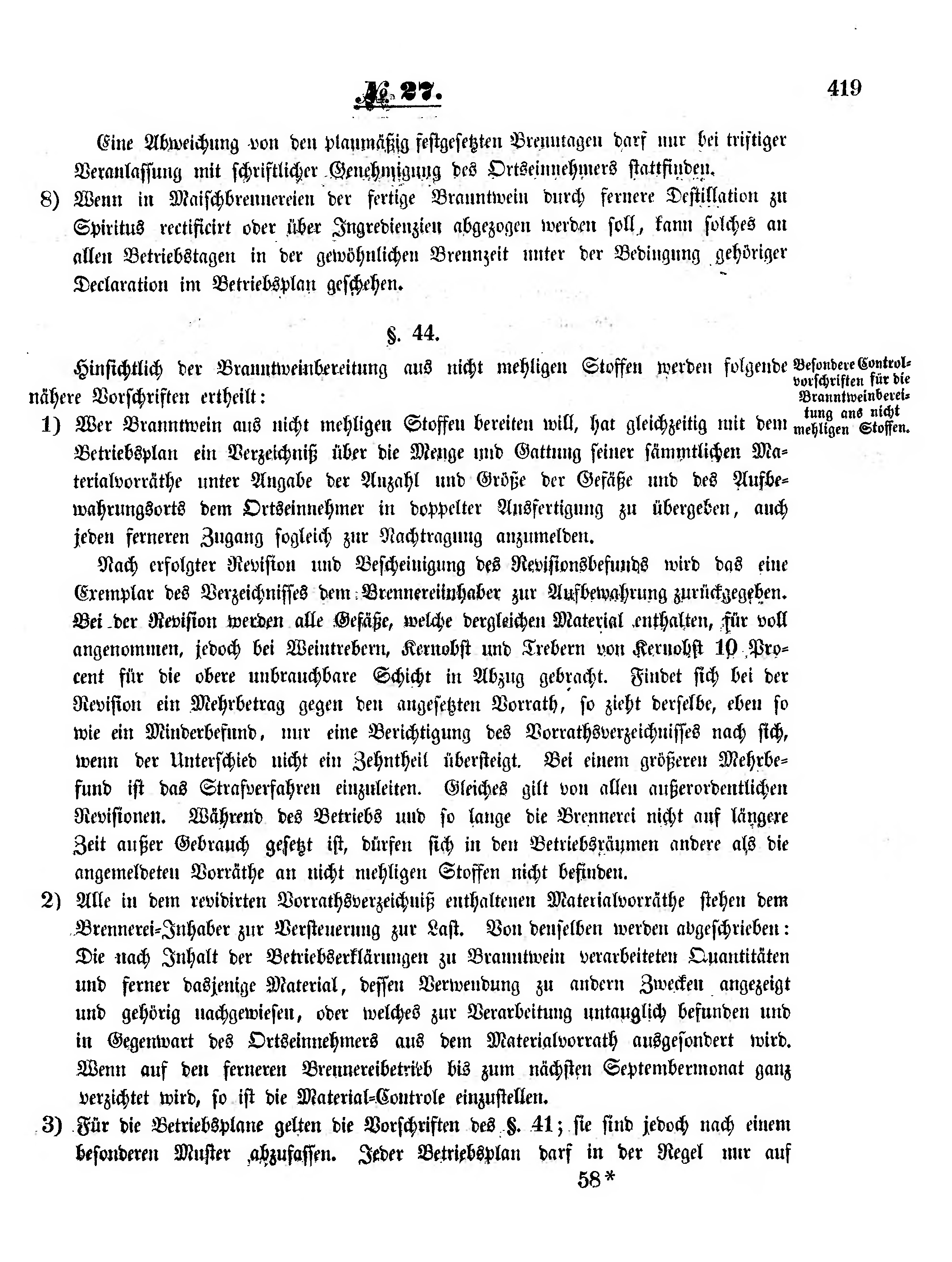 1) Wer Branntwein aus nicht mehligen Stoffen bereiten will, hat gleichzeitig mit dem Betriebsplan ein Verzeichniß über die Menge und Gattung seiner sämmtlichen Materialvorräthe unter Angabe der Anzahl und Größe der Gefäße und des Aufbewahrungsorts dem Ortseinnehmer in doppelter Ausfertigung zu übergeben, auch jeden ferneren Zugang sogleich zur Nachtragung anzumelden.