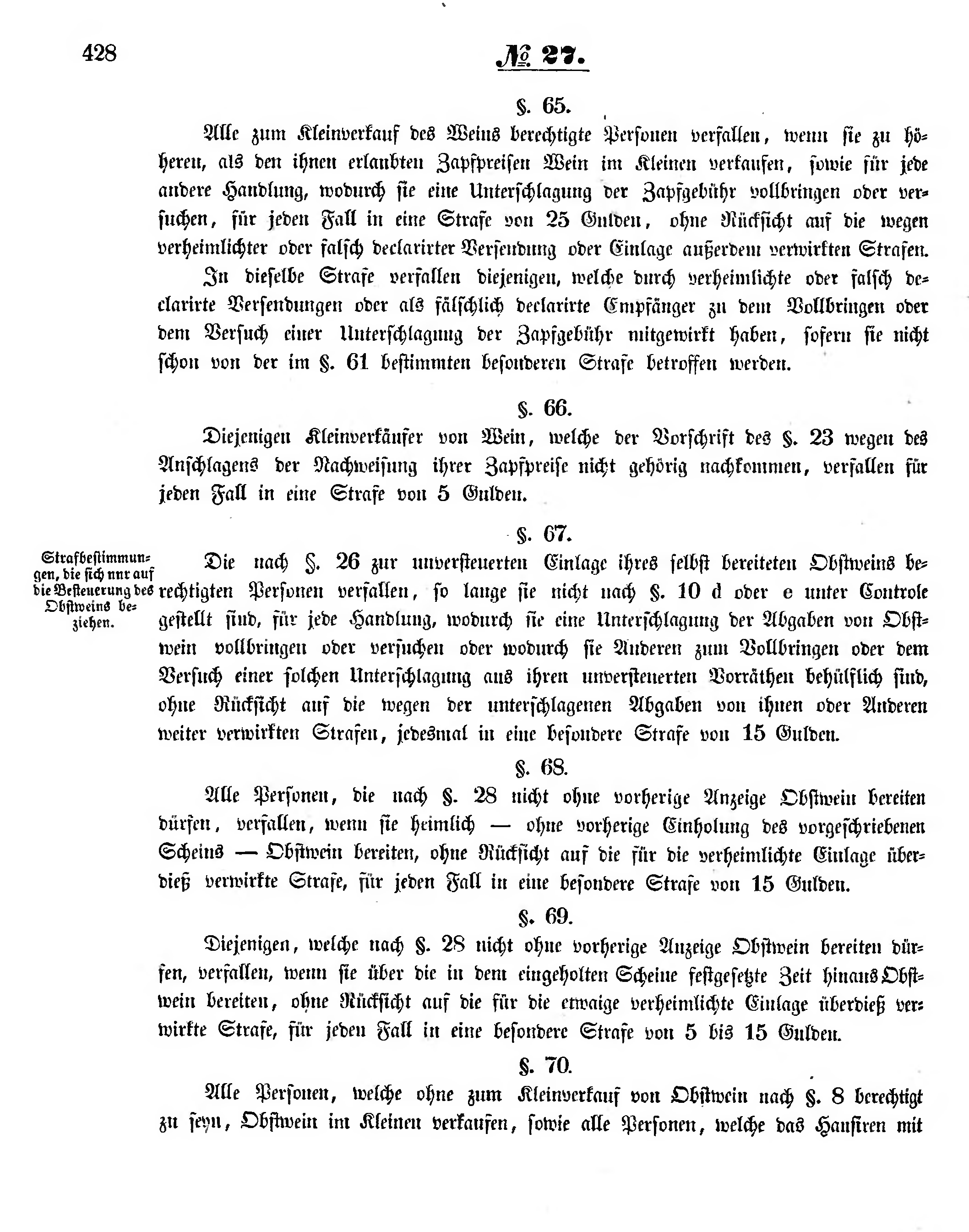 Alle zum Kleinverkauf des Weins berechtigte Personen verfallen, wenn sie zu höheren, als den ihnen erlaubten Zapfpreisen Wein im Kleinen verkaufen, sowie für jede andere Handlung, wodurch sie eine Unterschlagung der Zapfgebühr vollbringen oder versuchen, für jeden Fall in eine Strafe von 25 Gulden, ohne Rücksicht auf die wegen verheimlichter oder falsch declarirter Versendung oder Einlage außerdem verwirkten Strafen.