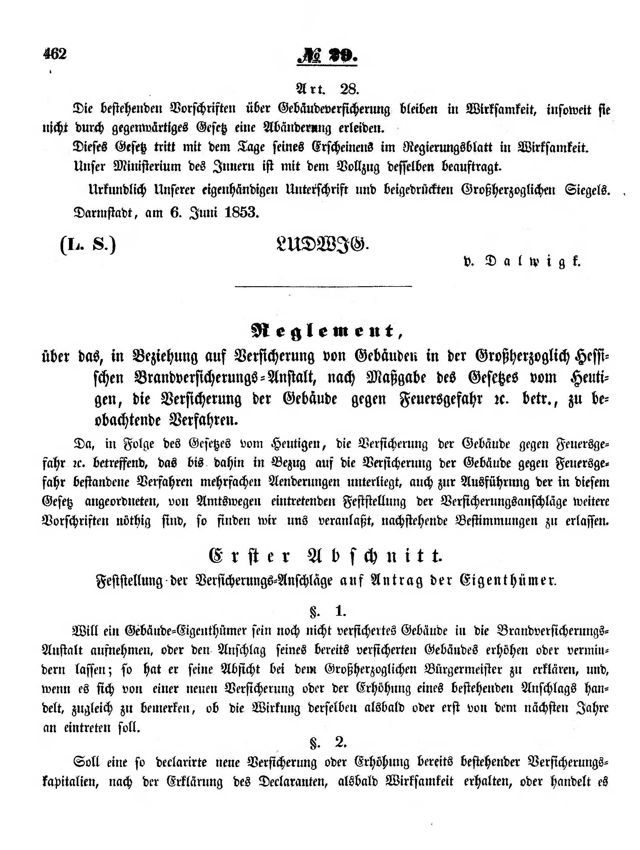 Da, in Folge des Gesetzes vom Heutigen, die Versicherung der Gebäude gegen Feuersgefahr etc. betreffend, das bis dahin in Bezug auf die Versicherung der Gebäude gegen Feuersgefahr bestandene Verfahren mehrfachen Aenderungen unterliegt, auch zur Ausführung der in diesem Gesetz angeordneten, von Amtswegen eintretenden Feststellung der Versicherungsanschläge weitere Vorschriften nöthig sind, so finden wir uns veranlaßt, nachstehende Bestimmungen zu erlassen.