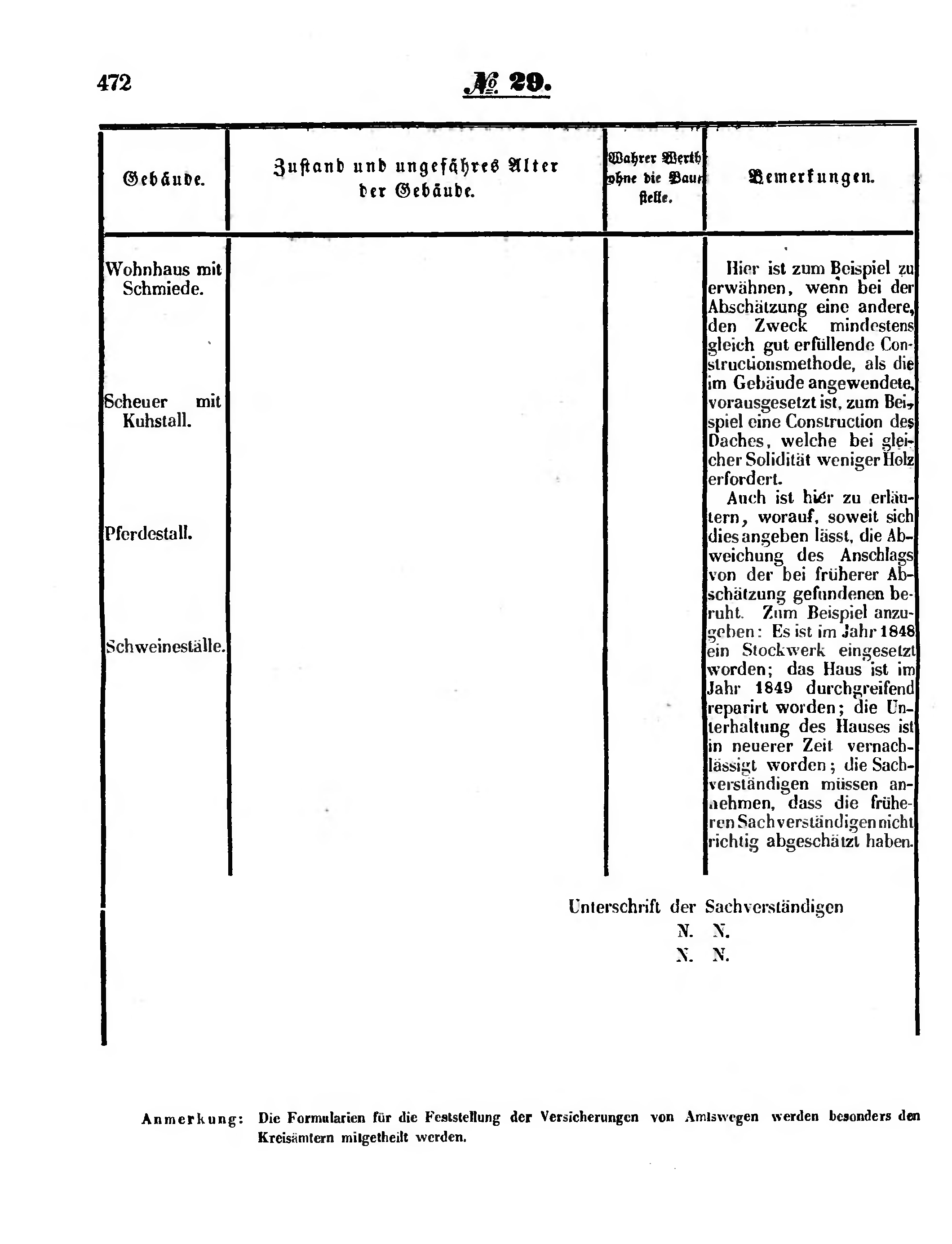 Hier ist zum Beispiel zu erwähnen, wenn bei der Abschätzung eine andere, den Zweck mindestens gleich gut erfüllende Constructionsmethode, als die im Gebäude angewendete, vorausgesetzt ist, zum Beispiel eine Construction des Daches, welche bei gleicher Solidität weniger Holz erfordert. Auch ist hier zu erläutern, worauf, soweit sich dies angeben lässt, die Abweichung des Anschlags von der bei früherer Abschätzung gefundenen beruht. Zum Beispiel anzugeben: Es ist im Jahr 1848 ein Stockwerk eingesetzt worden; das Haus ist im Jahr 1849 durchgreifend repariert worden; die Unterhaltung des Hauses ist in neuerer Zeit vernachlässigt worden; die Sachverständigen müssen annehmen, dass die früheren Sachverständigen nicht richtig abgeschätzt haben. |