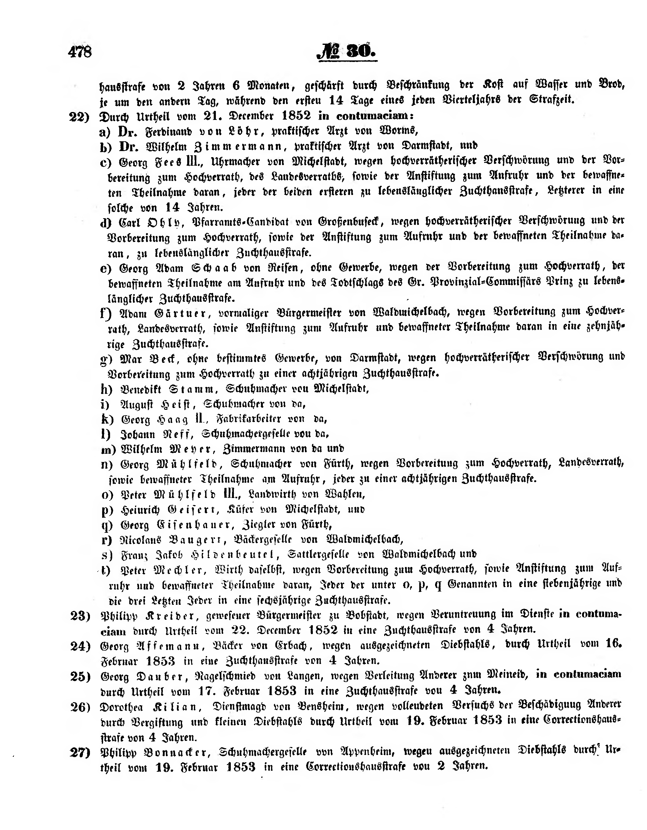 27) Philipp Bonnacker, Schuhmachergeselle von Appenheim, wegen ausgezeichneten Diebstahls durch Urtheil vom 19. Februar 1853 in eine Correctionshausstrafe von 2 Jahren.