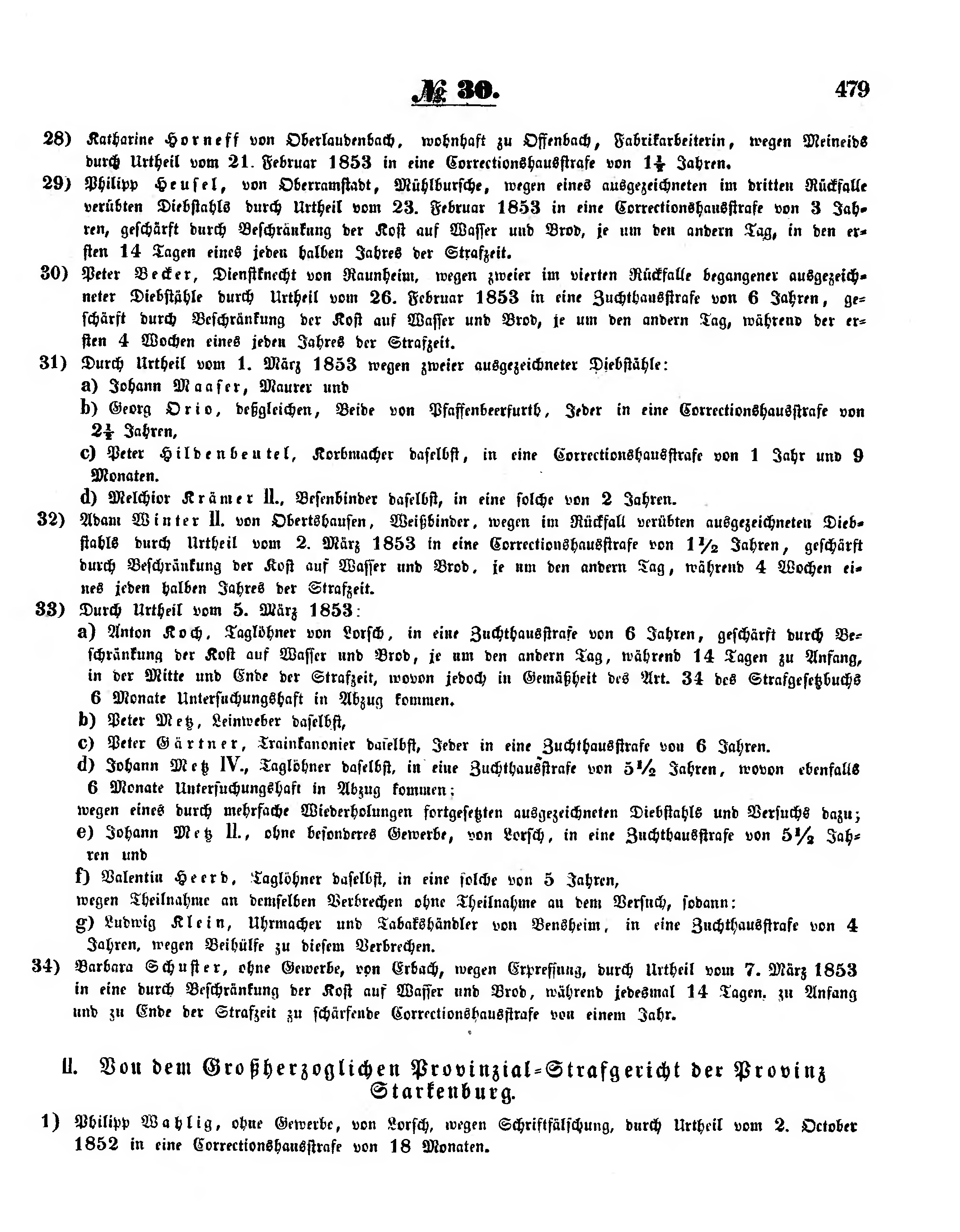 30) Peter Becker, Dienstknecht von Raunheim, wegen zweier im vierten Rückfalle begangener ausgezeichneter Diebstähle durch Urtheil vom 26. Februar 1853 in eine Zuchthausstrafe von 6 Jahren, geschärft durch Beschränkung der Kost auf Wasser und Brod, je um den andern Tag, während der ersten 4 Wochen eines jeden Jahres der Strafzeit.
