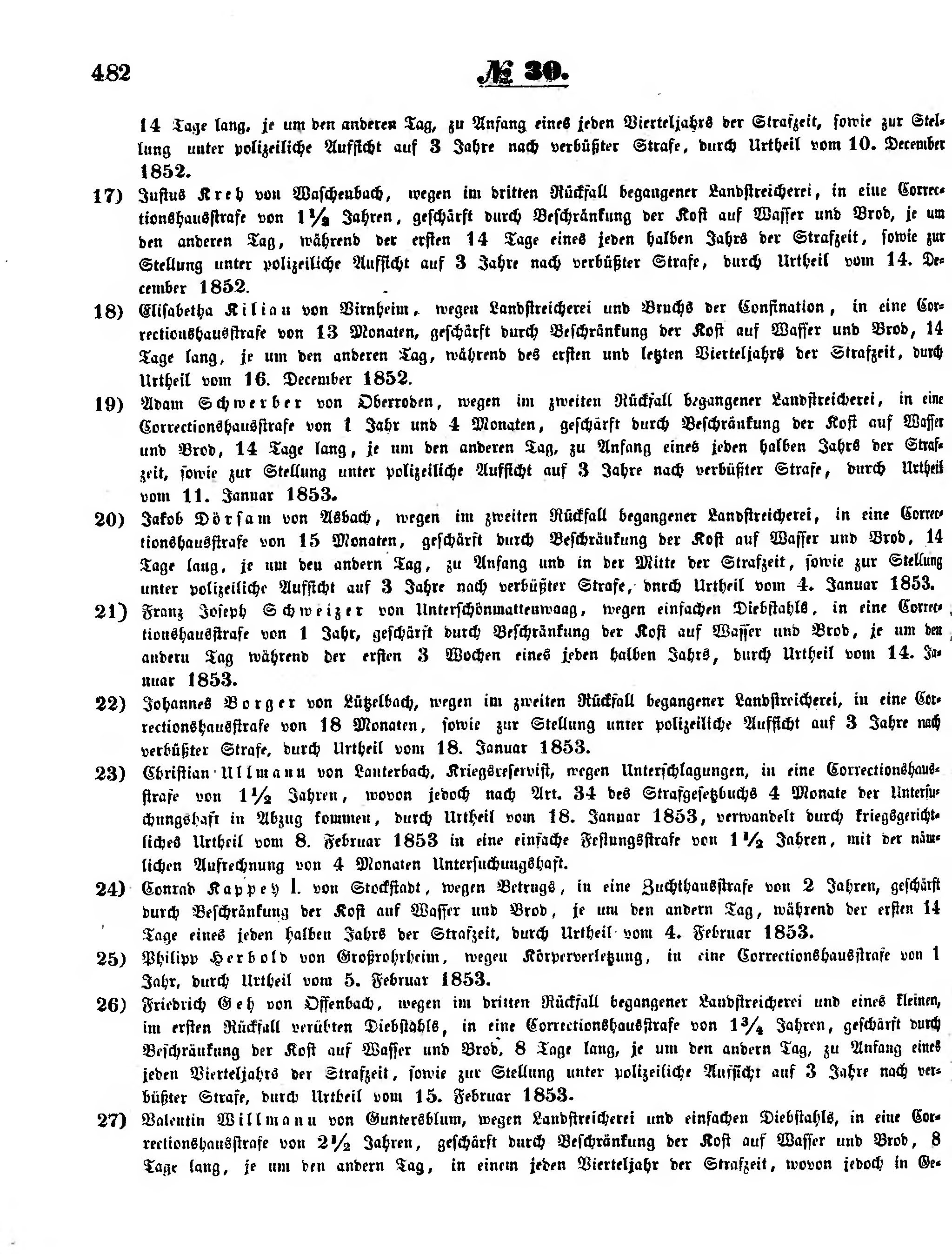 18) Elisabetha Kilian von Virnheim, wegen Landstreicherei und Bruchs der Confination, in eine Correctionshausstrafe von 13 Monaten, geschärft durch Beschränkung der Kost auf Wasser und Brod, 14 Tage lang, je um den anderen Tag, während des ersten und letzten Vierteljahrs der Strafzeit, durch Urtheil vom 16. December 1852.