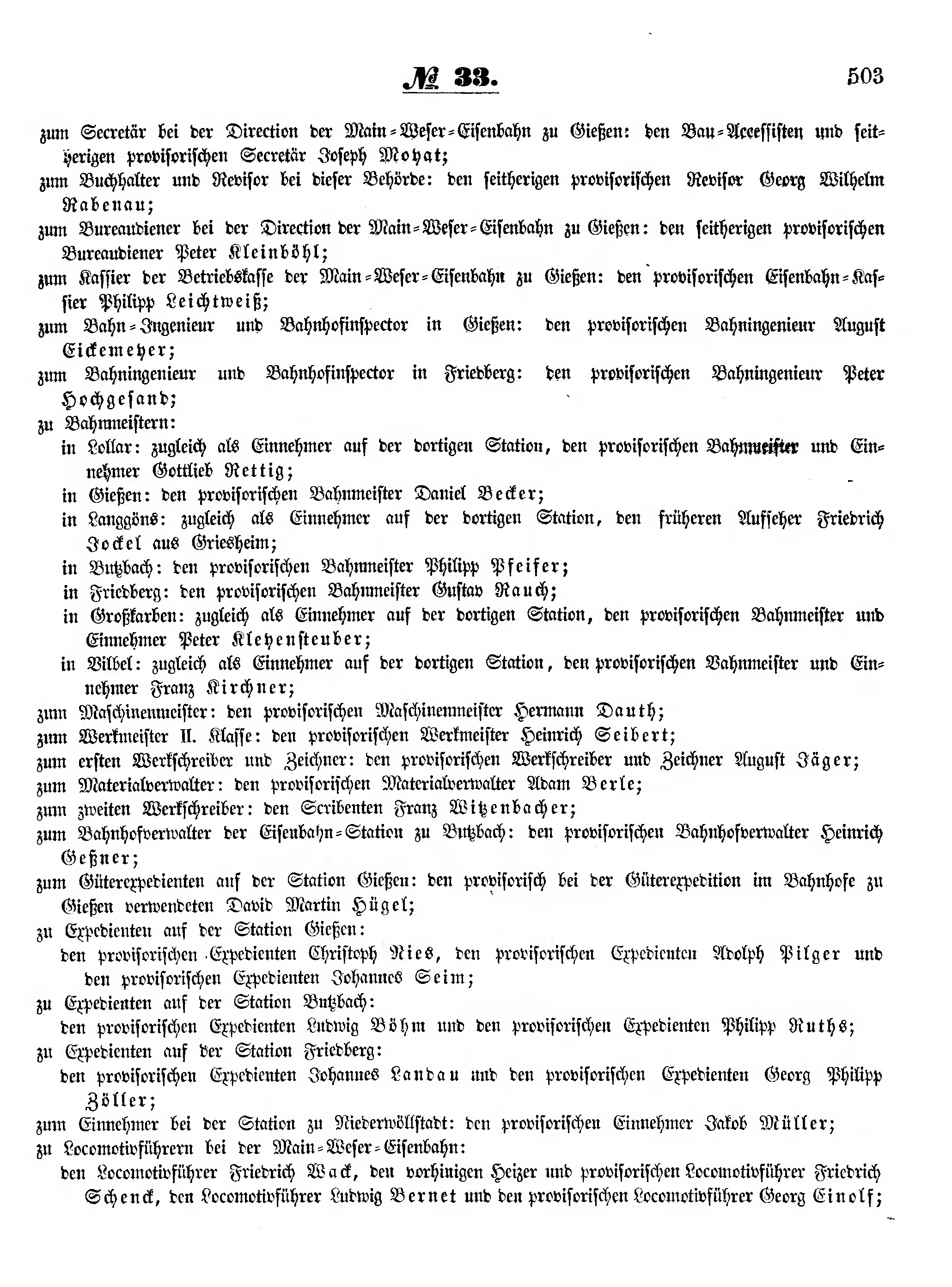 zum Secretär bei der Direction der Main-Weser-Eisenbahn zu Gießen: den Bau-Accessisten und seitherigen provisorischen Secretär Joseph Moyat;