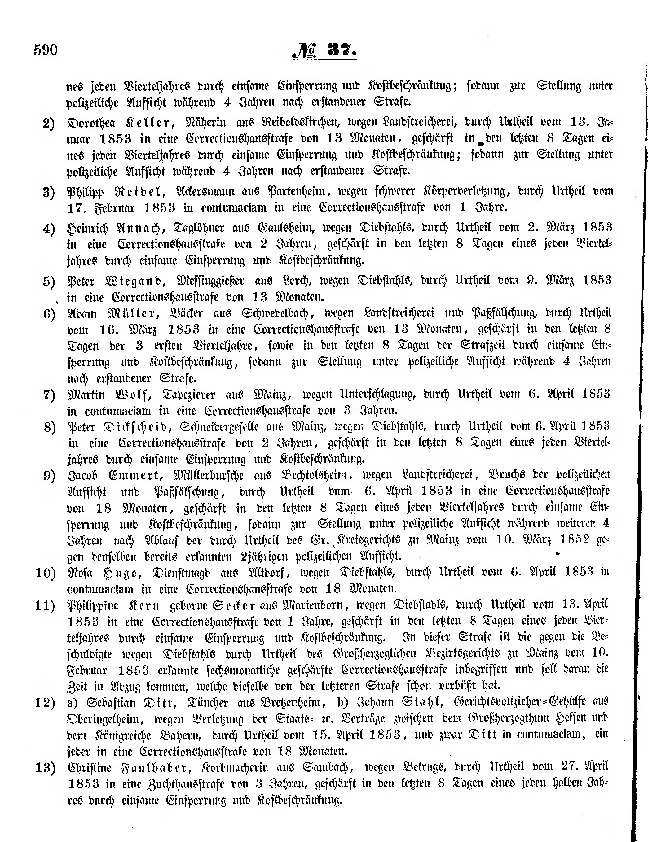 9) Jacob Emmert, Müllerbursche aus Bechtolsheim, wegen Landstreicherei, Bruchs der polizeilichen Aufsicht und Paßfälschung, durch Urtheil vom 6. April 1853 in eine Correctionshausstrafe von 18 Monaten, geschärft in den letzten 8 Tagen eines jeden Vierteljahres durch einsame Einsperrung und Kostbeschränkung, sodann zur Stellung unter polizeiliche Aufsicht während weiteren 4 Jahren nach Ablauf der durch Urtheil des Gr. Kreisgerichts zu Mainz vom 10. März 1852 gegen denselben bereits erkannten 2jährigen polizeilichen Aufsicht.