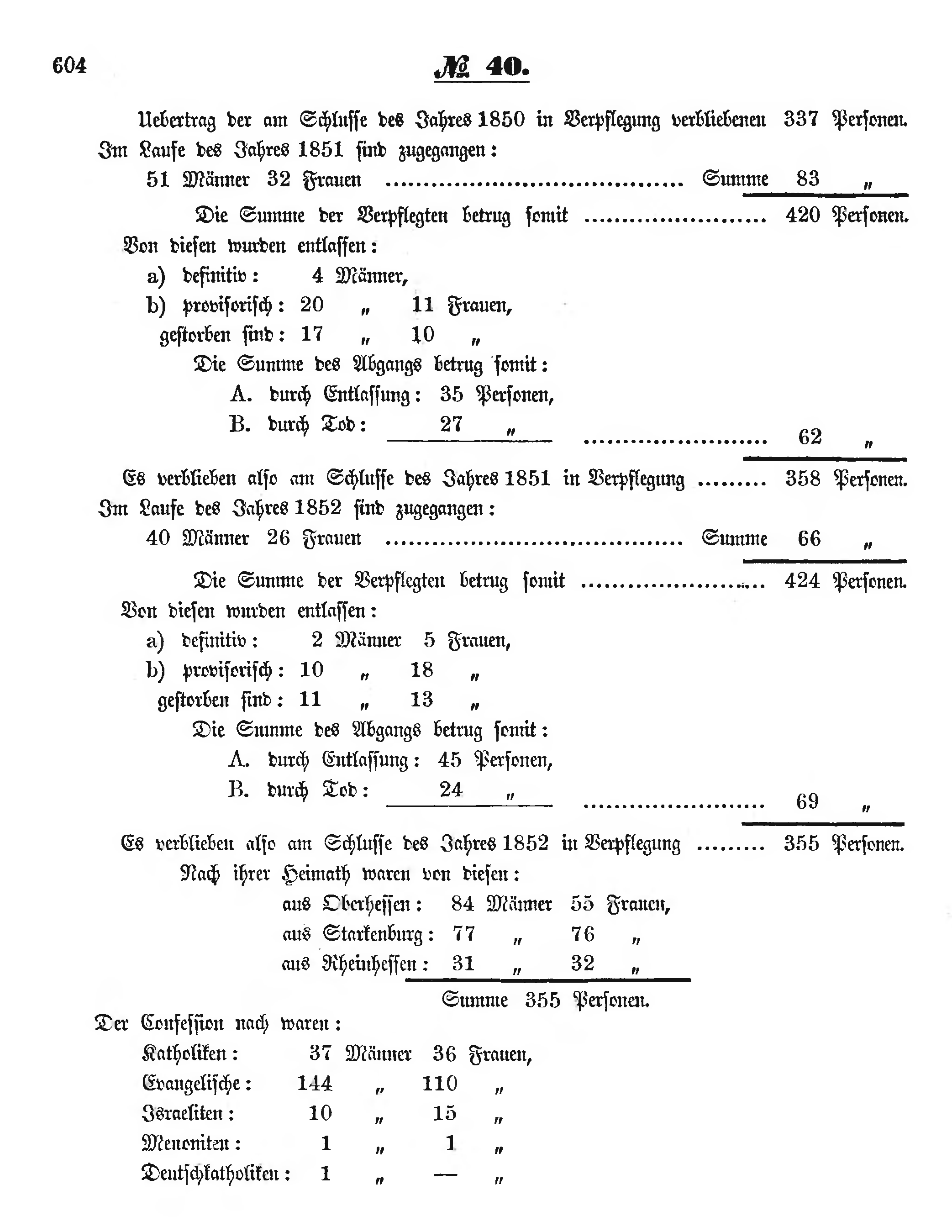 | Es verblieben also am Schlusse des Jahres 1852 in Verpflegung | 355 | Personen. | ||||||||