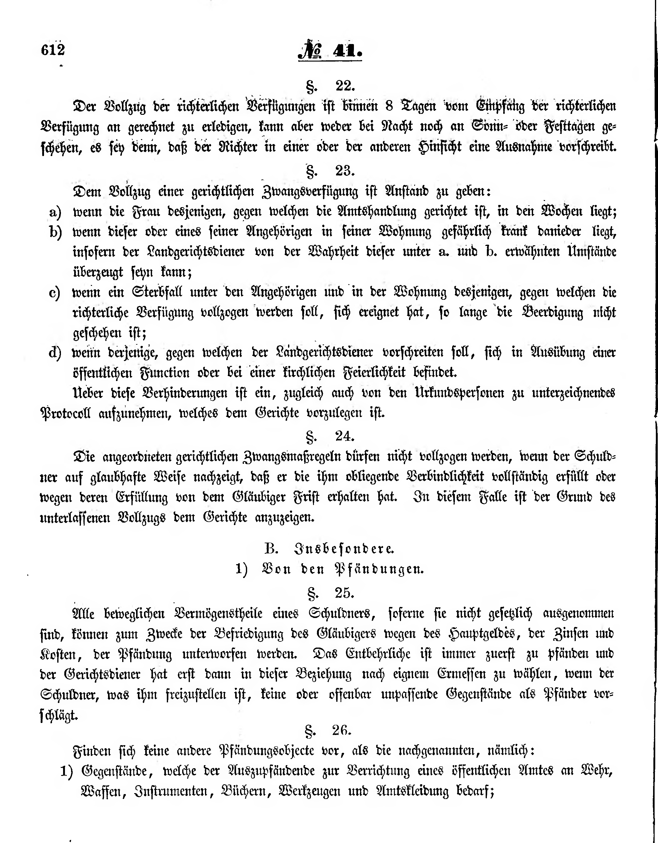 Alle beweglichen Vermögenstheile eines Schuldners, soferne sie nicht gesetzlich ausgenommen sind, können zum Zwecke der Befriedigung des Gläubigers wegen des Hauptgeldes, der Zinsen und Kosten, der Pfändung unterworfen werden. Das Entbehrliche ist immer zuerst zu pfänden und der Gerichtsdiener hat erst dann in dieser Beziehung nach eignem Ermessen zu wählen, wenn der Schuldner, was ihm freizustellen ist, keine oder offenbar unpassende Gegenstände als Pfänder vorschlägt.