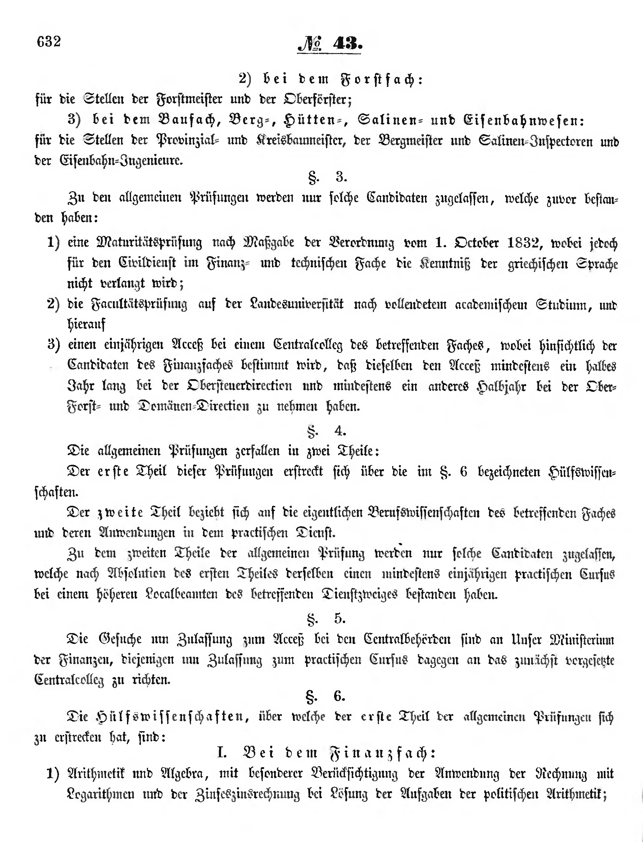 - 1) eine Maturitätsprüfung nach Maßgabe der Verordnung vom 1. October 1832, wobei jedoch für den Civildienst im Finanz- und technischen Fache die Kenntniß der griechischen Sprache nicht verlangt wird;