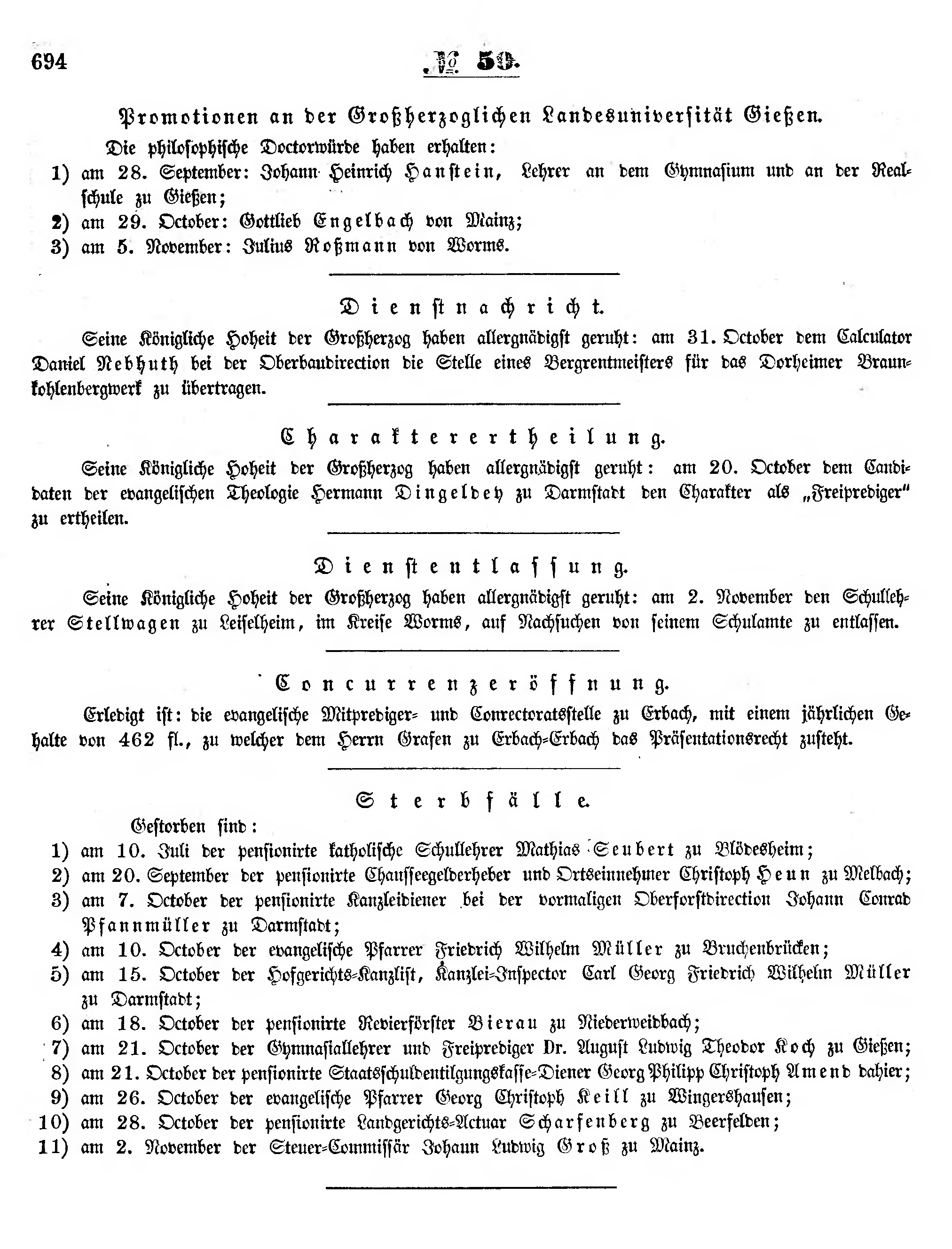 Seine Königliche Hoheit der Großherzog haben allergnädigst geruht: am 31. October dem Calculator Daniel Nebhuth bei der Oberbaudirection die Stelle eines Bergrentmeisters für das Dorheimer Braunkohlenbergwerk zu übertragen.