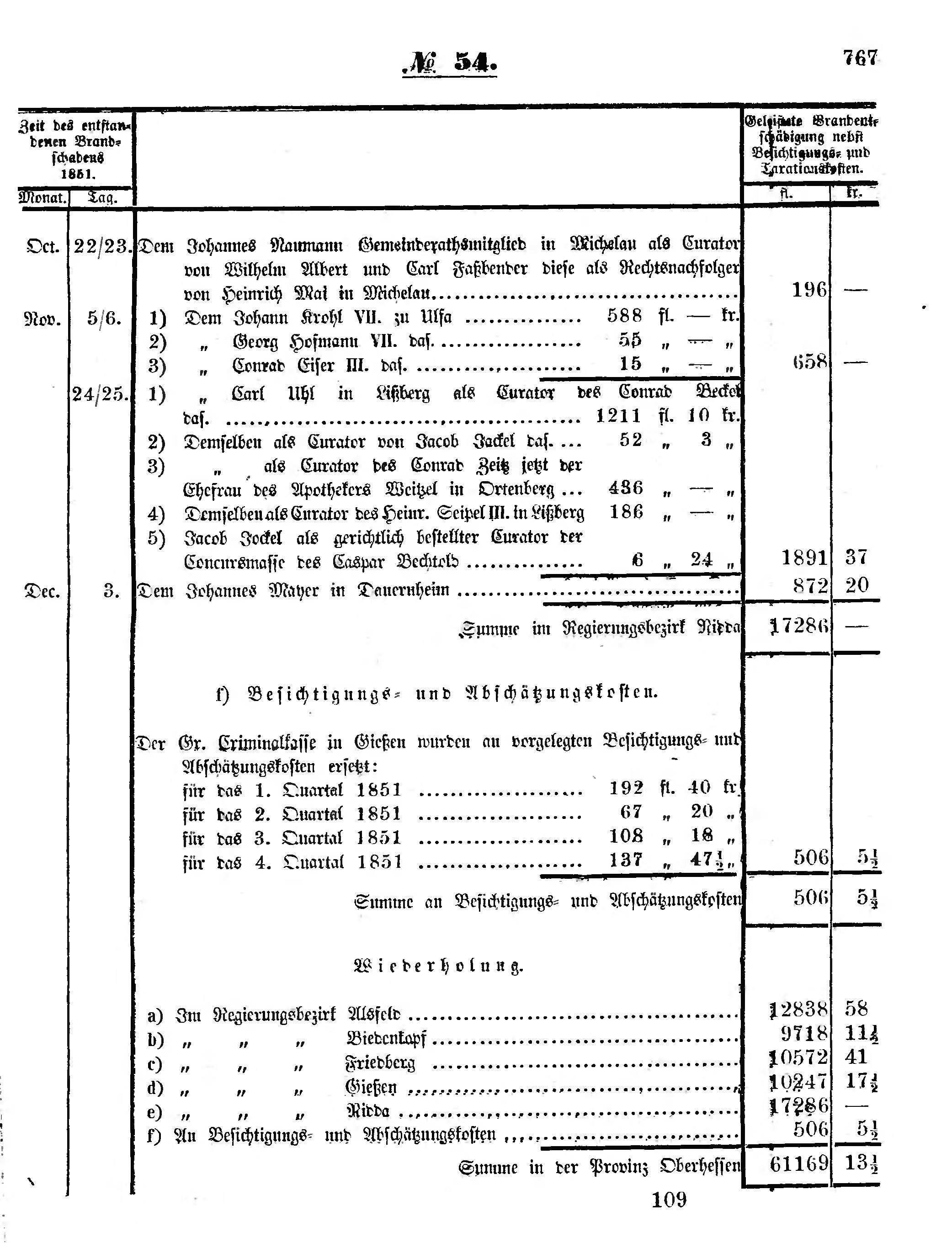 Der Gr. Criminalkasse in Gießen wurden an vorgelegten Besichtigungs- und Abschätzungskosten ersetzt|
