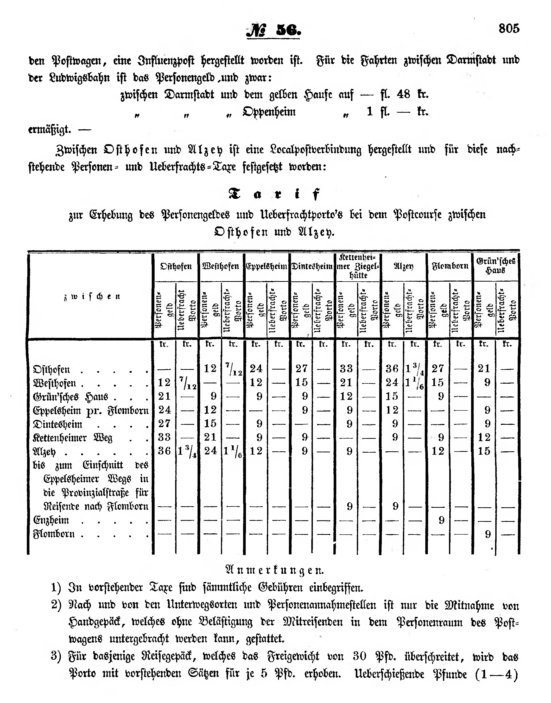 ermäßigt. - Zwischen Osthofen und Alzey ist eine Localpostverbindung hergestellt und für diese nachstehende Personen- und Ueberfrachts-Taxe festgesetzt worden: