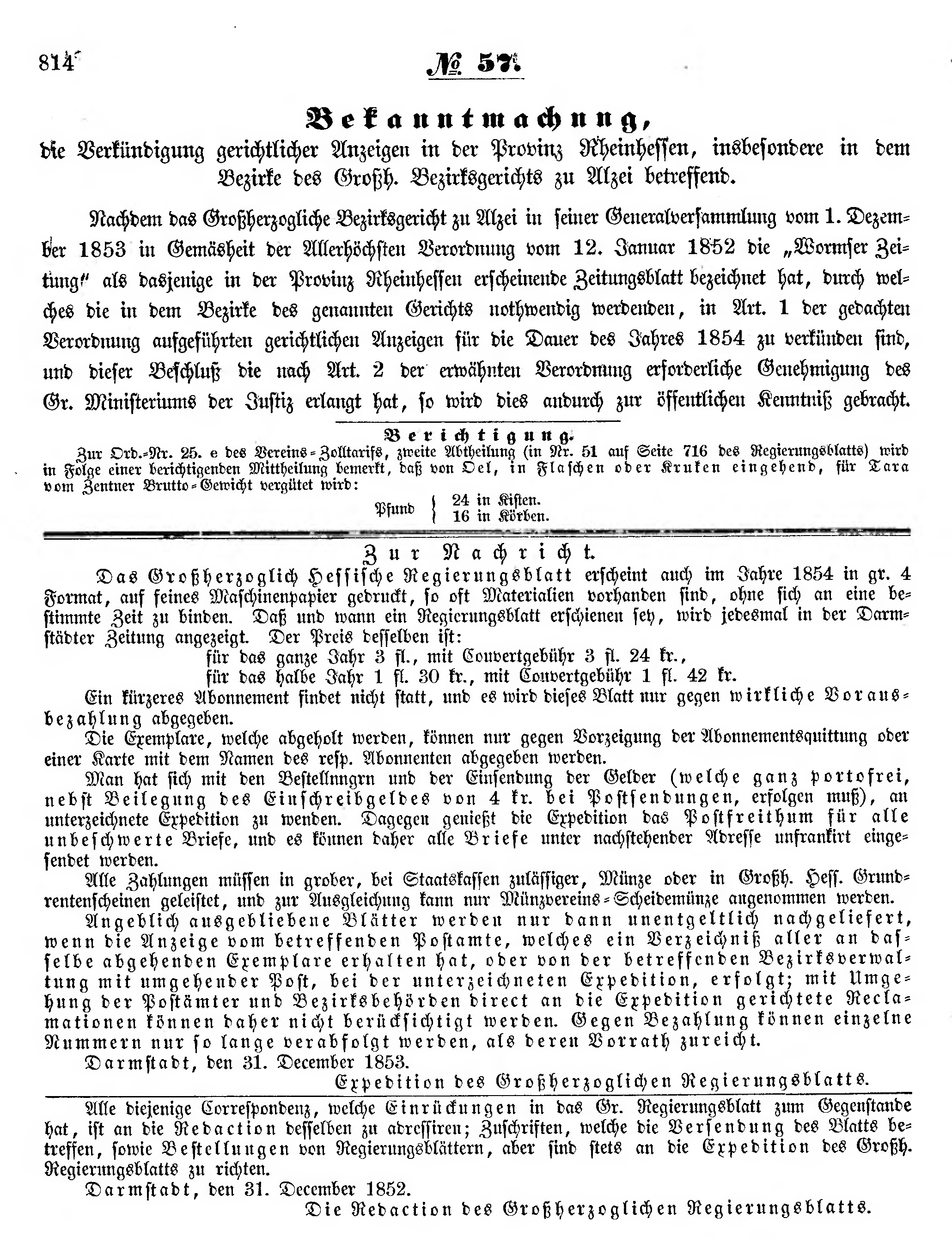 Das Großherzoglich Hessische Regierungsblatt erscheint auch im Jahre 1854 in gr. 4 Format, auf feines Maschinenpapier gedruckt, so oft Materialien vorhanden sind, ohne sich an eine bestimmte Zeit zu binden. Daß und wann ein Regierungsblatt erschienen sey, wird jedesmal in der Darmstädter Zeitung angezeigt. Der Preis desselben ist: