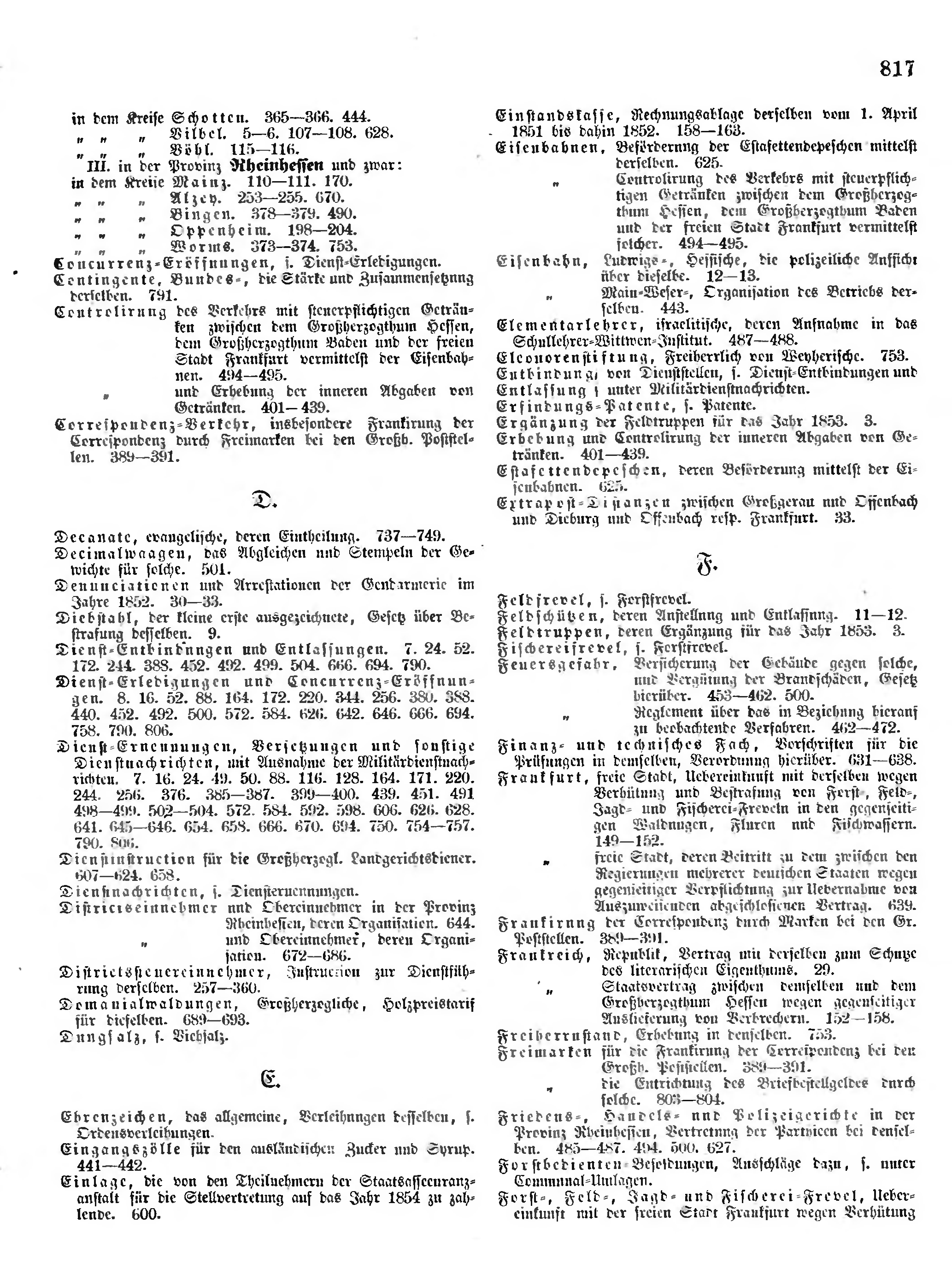 Einstandskasse, Rechnungsablage derselben vom 1. April 1851 bis dahin 1852. 158 -163 . Eisenbahnen, Beförderung der Estafettendepeschen mittelst derselben. 625 . Eisenbahnen, Controlirung des Verkehrs mit steuerpflichtigen Getränken zwischen dem Großherzogthum Hessen, dem Großherzogthum Baden und der freien Stadt Frankfurt vermittelst solcher. 494 -495 . Eisenbahn, Ludwigs-, Hessische, die polizeiliche Aufsicht über dieselbe. 12 -13 . Eisenbahn, Main-Weser-, Organisation des Betriebs derselben. 443 . Elementarlehrer, israelitische, deren Aufnahme in das Schullehrer-Wittwen-Institut. 487 -488 . Eleonorenstiftung, Freiherrlich von Weyherische. 753 . Entbindung von Dienststellen und Entlassung, s. Dienst-Entbindungen und Militärdienstnachrichten. Erfindungs-Patente. s. Patente. Ergänzung der Feldtruppen für das Jahr 1853. 3 . Erhebung und Controlirung der inneren Abgaben von Getränken. 401 -439 . Estafettendepeschen, deren Beförderung mittelst der Eisenbahnen. 625 . Extrapost-Distanzen zwischen Großgerau und Offenbach und Dieburg und Offenbach resp. Frankfurt. 33 . Feldfrevel, s. Forstfrevel. Feldschützen, deren Anstellung und Entlassung. 11 -12 . Feldtruppen, deren Ergänzung für das Jahr 1853. 3 . Fischereifrevel, s. Forstfrevel. Feuersgefahr, Versicherung der Gebäude gegen solche, und Vergütung der Brandschäden, Gesetz hierüber. 453 -462 . 500 . Feuersgefahr, Reglement über das in Beziehung hierauf zu beobachtende Verfahren. 462 -472 . Finanz- und technisches Fach, Vorschriften für die Prüfungen in demselben, Verordnung hierüber. 631 -638 . Frankfurt, freie Stadt, Uebereinkunft mit derselben wegen Verhütung und Bestrafung von Forst-, Feld-, Jagd- und Fischerei-Freveln in den gegenseitigen Waldungen, Fluren und Fischwassern. 149 -152 . Frankfurt, freie Stadt, deren Beitritt zu dem zwischen den Regierungen mehrerer deutschen Staaten wegen gegenseitiger Verpflichtung zur Uebernahme von Auszuweisenden abgeschlossenen Vertrag. 639 . Frankirung der Correspondenz durch Marken bei den Gr. Poststellen. 389 -391 . Frankreich, Republik, Vertrag mit derselben zum Schutze des literarischen Eigenthums. 29 . Frankreich, Staatsvertrag zwischen demselben und dem Großherzogthum Hessen wegen gegenseitiger Auslieferung von Verbrechern. 152 -158 . Freiherrnstand, Erhebung in denselben. 753 . Freimarken für die Frankirung der Correspondenz bei den Großh. Poststellen. 389 -391 . Freimarken die Entrichtung des Briefbestellgeldes durch solche. 803 -804 . Friedens-, Handels- und Polizeigerichte in der Provinz Rheinhessen, Vertretung der Parthieen bei denselben. 485 -487 . 494 . 500 . 627 . Forstbedienten-Besoldungen, Ausschläge dazu, s. unter Communal-Umlagen. Forst-, Feld-, Jagd- und Fischerei-Frevel, Uebereinkunft mit der freien Stadt Frankfurt wegen Verhütung. |
