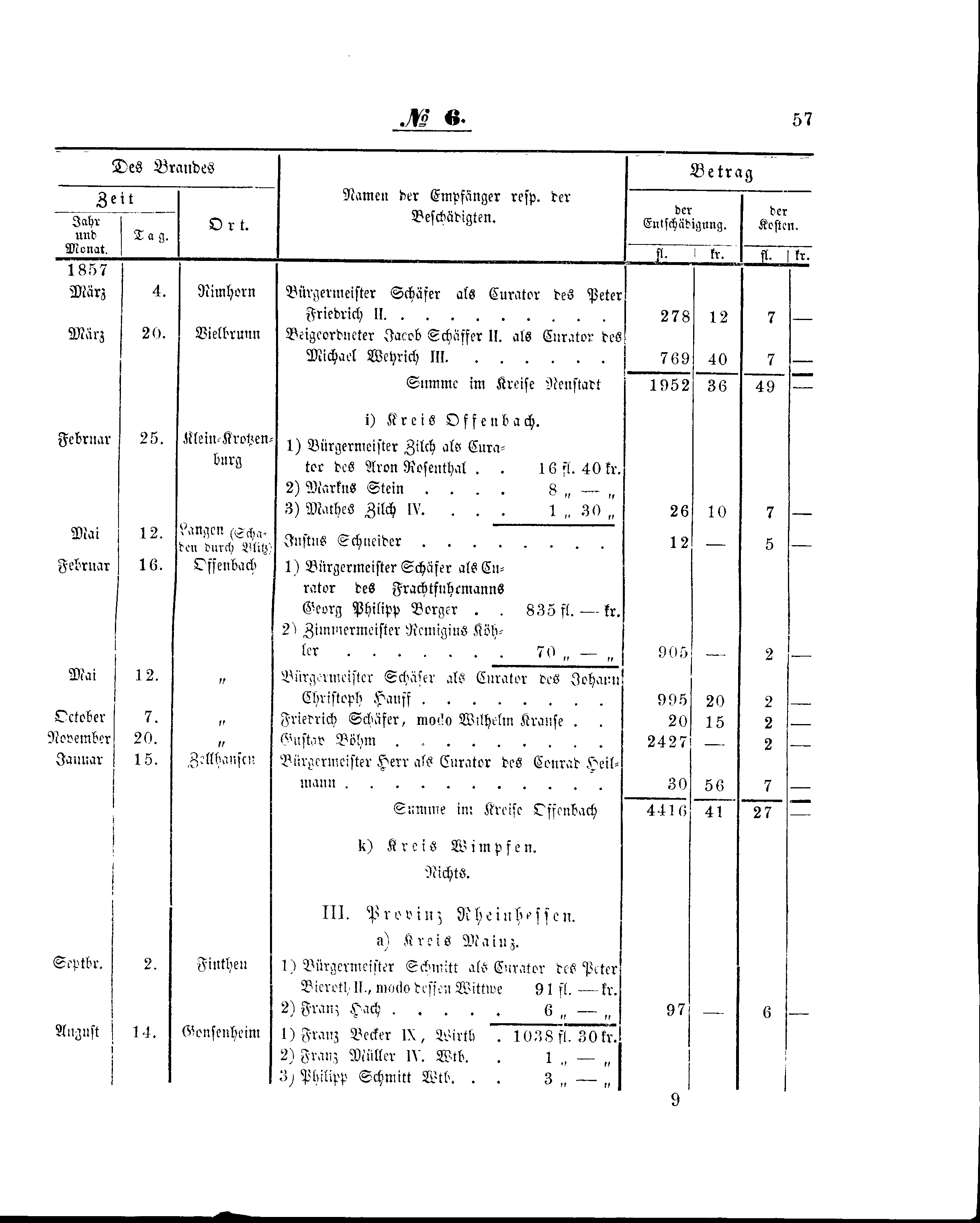 | Februar | 16. | Offenbach | 1) | Bürgermeister Schäfer als Curator des Frachtfuhrmanns Georg Philipp Borger | 835 | fl. | - | kr. | |||||