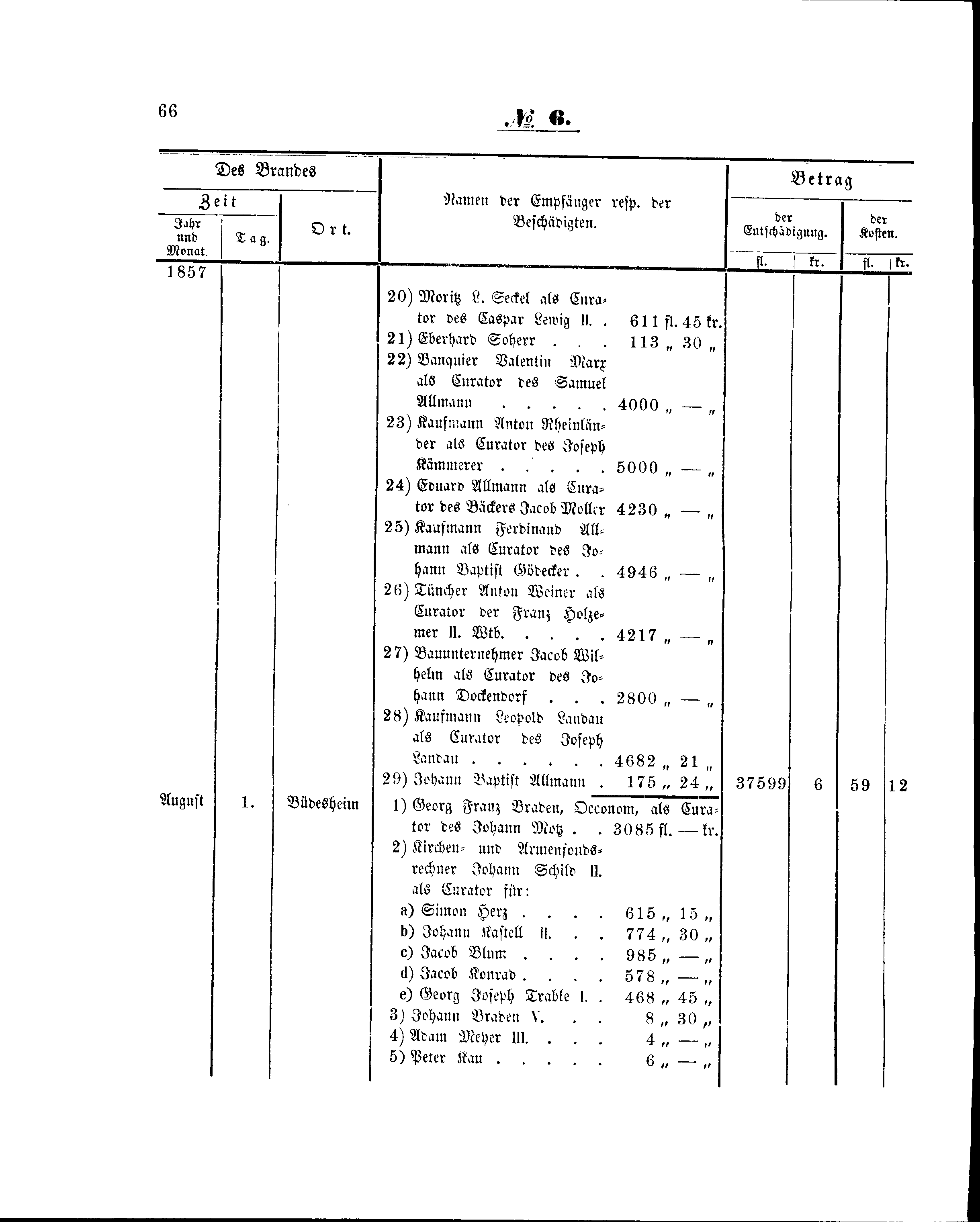 | August | 1. | Büdesheim | 1) | Georg Franz Braden, Oeconom, als Curator des Johann Motz | 3085 | fl. | - | kr. | |||||