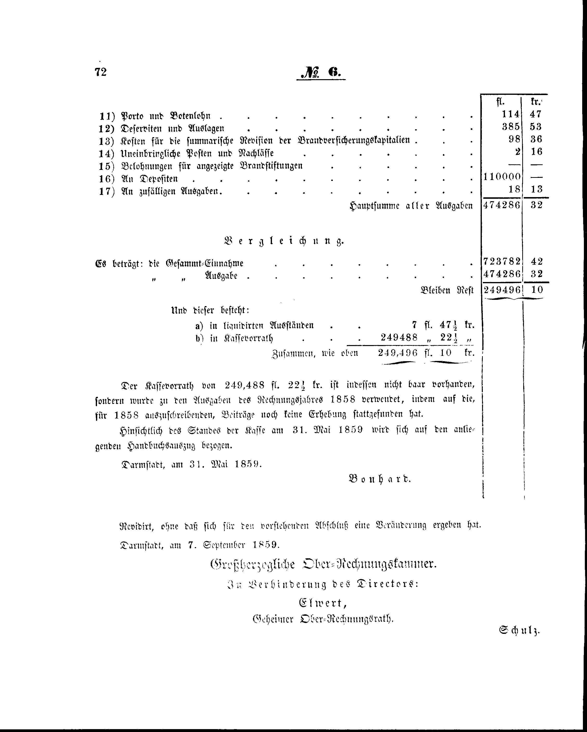 | Revidirt, ohne daß sich für den vorstehenden Abschluß eine Veränderung ergeben hat. Darmstadt, am 7. September 1859. |