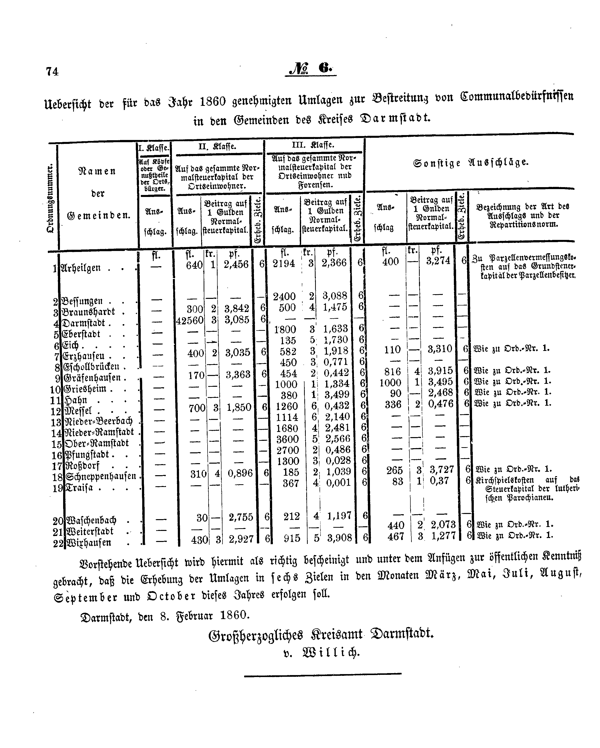 Uebersicht der für das Jahr 1860 genehmigten Umlagen zur Bestreitung von Communalbedürfnissen in den Gemeinden des Kreises Darmstadt.