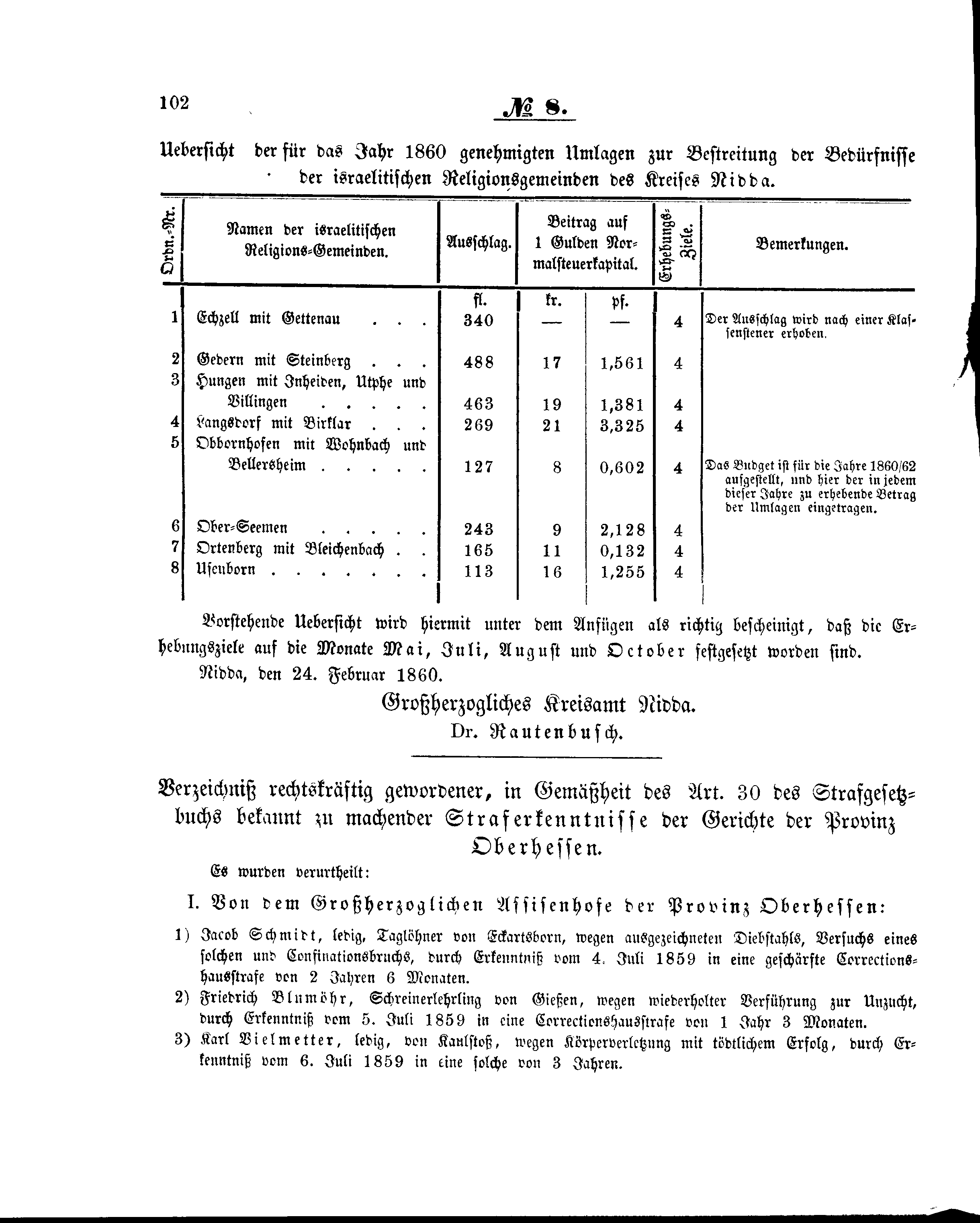 Uebersicht der für das Jahr 1860 genehmigten Umlagen zur Bestreitung der Bedürfnisse der israelitischen Religionsgemeinden des Kreises Nidda.